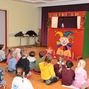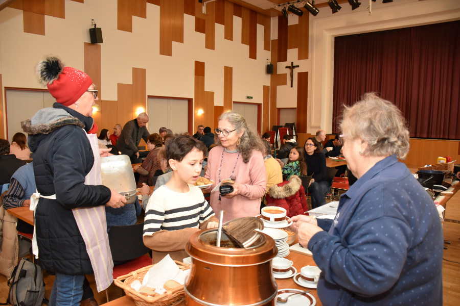 Anschließend wartete der Kasperl im Mariensaal auf die Kinder. Er und sein Freund Seppl hatten wieder eine spannende Geschichte für sie bereit. Im Josefisaal wurden Suppen, Bratwürstel, Sauerkraut und Kartoffelschmarrn serviert. Und für den Nachtisch standen Kuchen bereit.