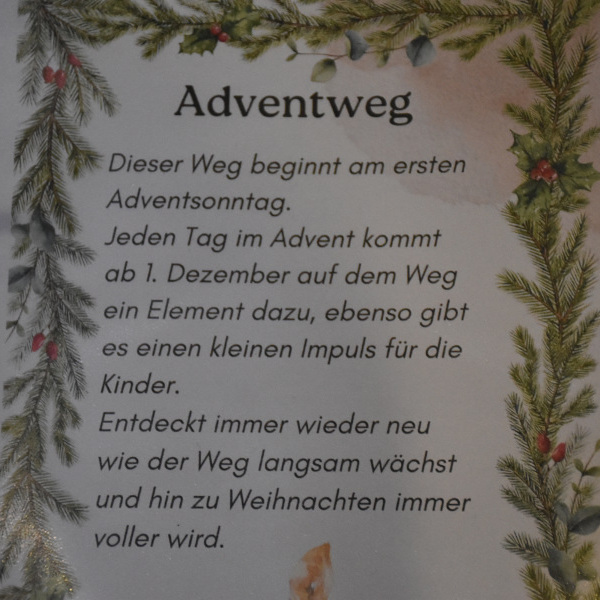 Für die Kinder wartet in der Kinderecke ein Adventweg, der immer um ein Stückchen erweitert wird. Diesen Sonntag durften sie sich Steine zum Bemalen mitnehmen, die dann den Weg schmücken. Es wurde auch das Kinderpfarrblatt ausgeteilt, das einige Anregungen für die Adventzeit enthält.
