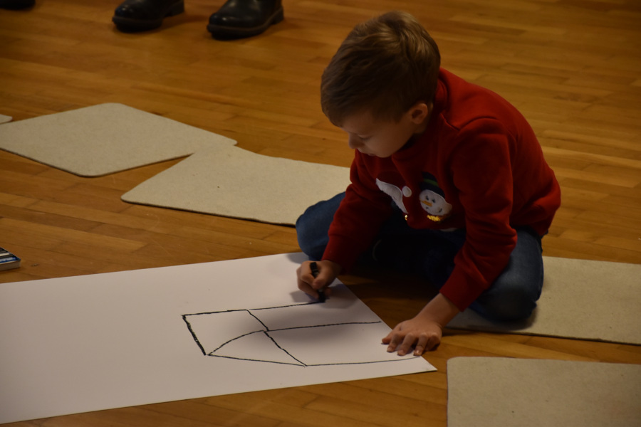 Es wurden viele Herbergen gezeichnet und um den Weihnachtsweg gelegt. Anschließend gingen die Kinder den Weihnachtsweg mit ihren Kerzen, die sie dann auf ihre Häuser, Höhlen etc. stellten, damit es etwas heller wird. Auch der Nikolaus war unterwegs, ließ in jedem Haus eine Kleinigkeit liegen. Nikolaus war auch Herberge für andere.