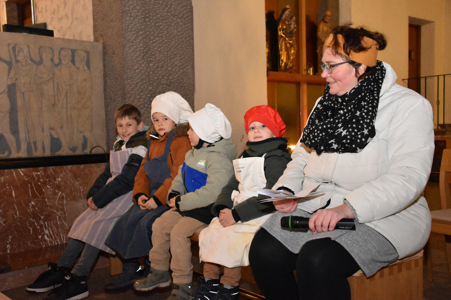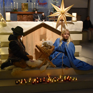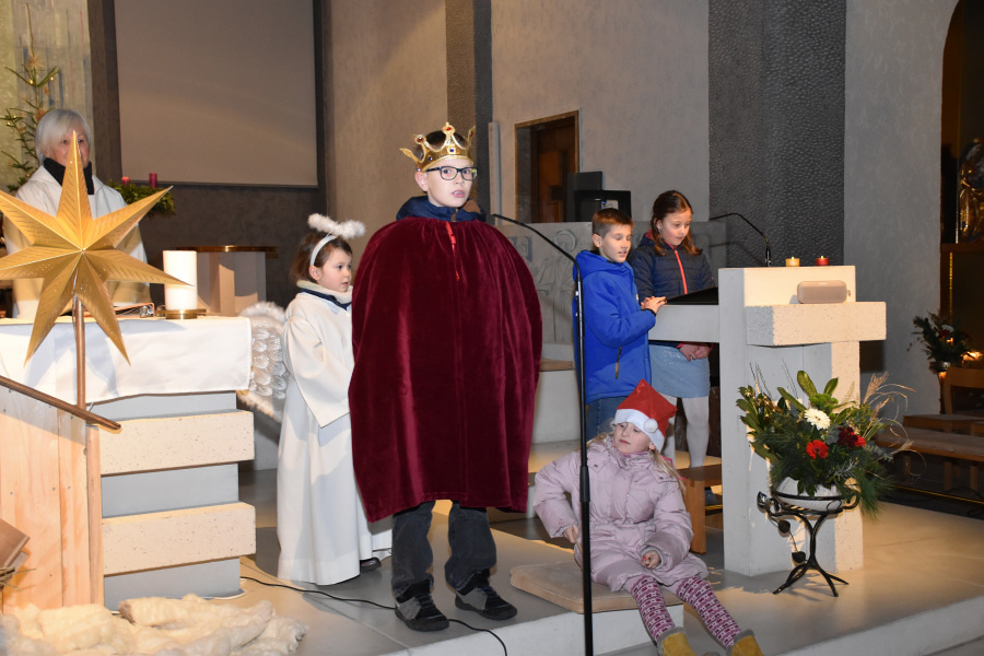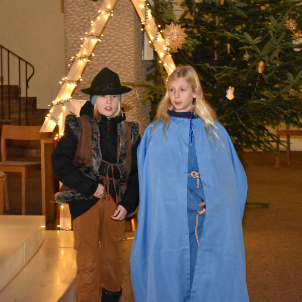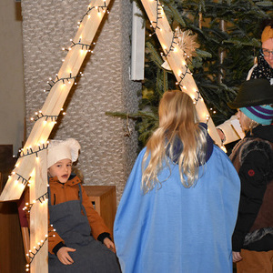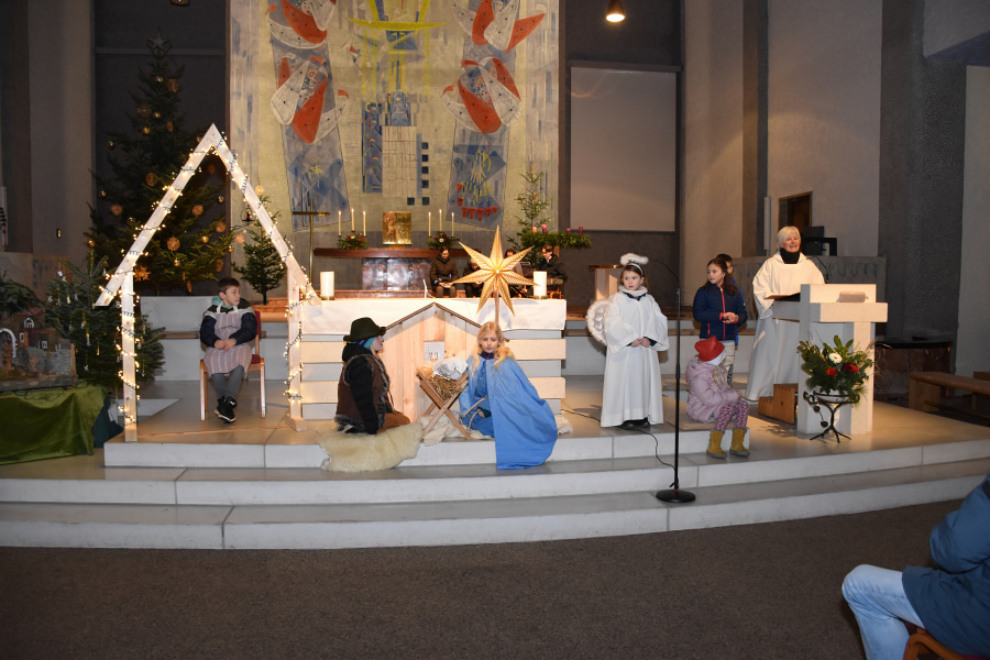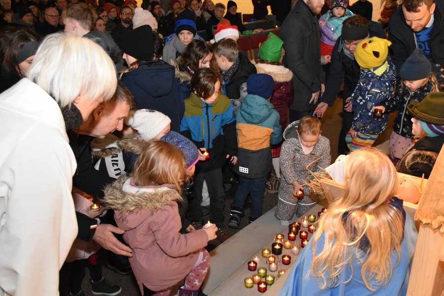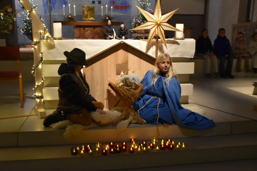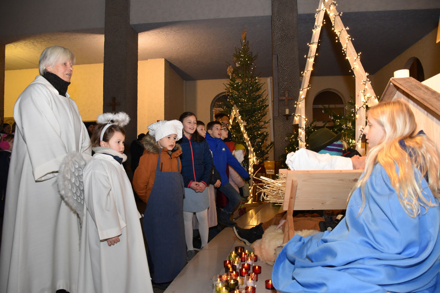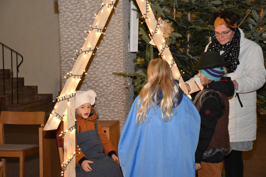 Die Geschichte von Maria und Josef, die nach Betlehem zur Volkszählung kamen und keine Herberge fanden, wurde von kleinen Schauspielern erzählt und gespielt. Die schwangere Maria und Josef mussten in einem Stall nächtigen, in dem nur eine Futterkrippe stand. Und genau dort bettete Maria ihren neugeborenen Sohn in Windeln gewickelt auf Stroh.