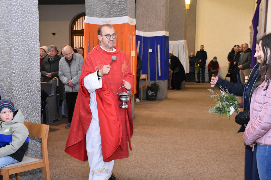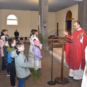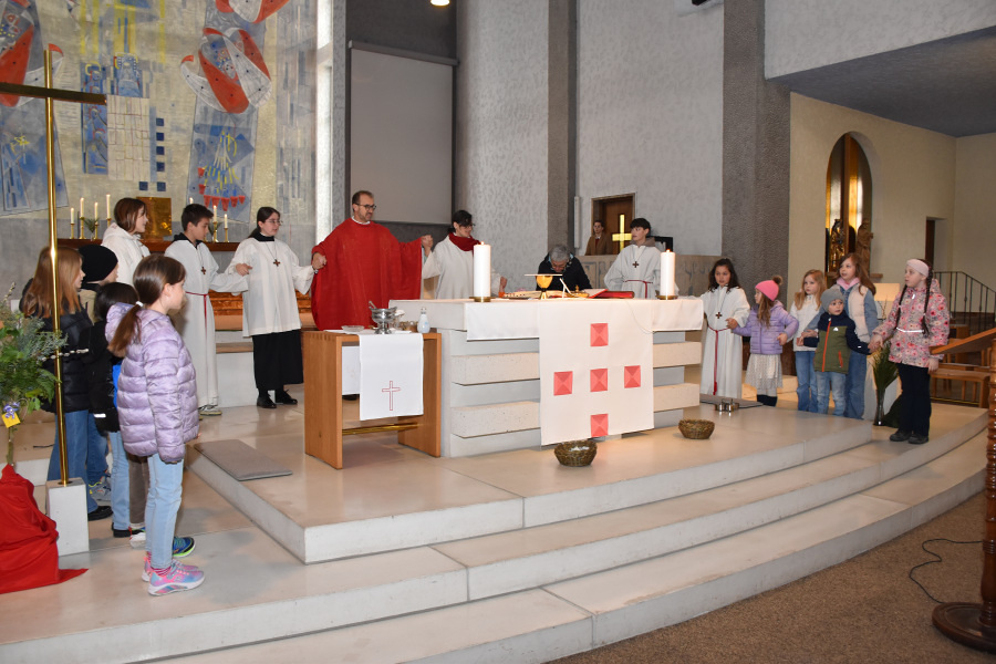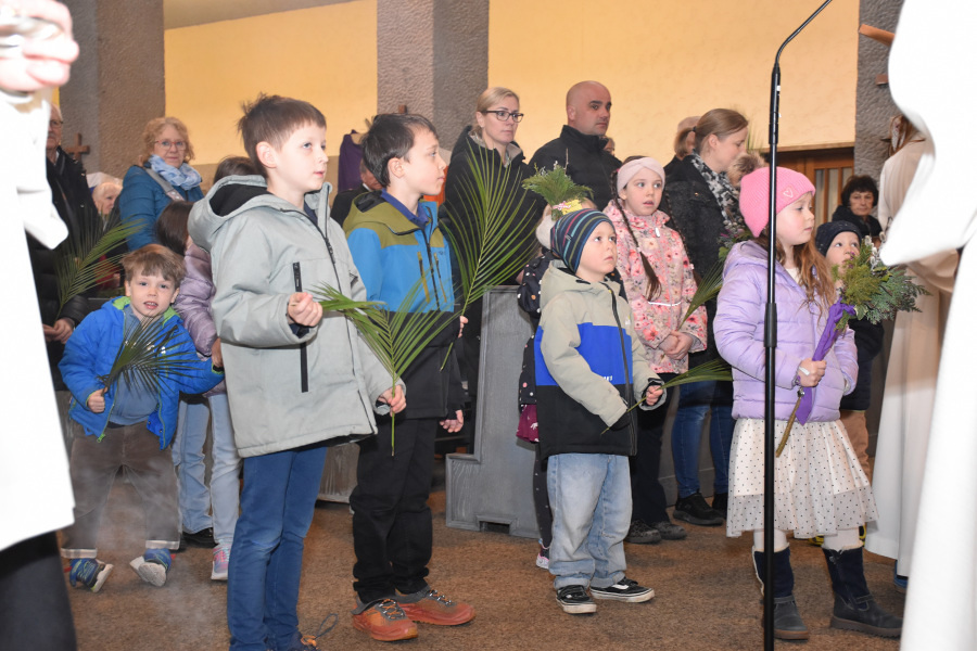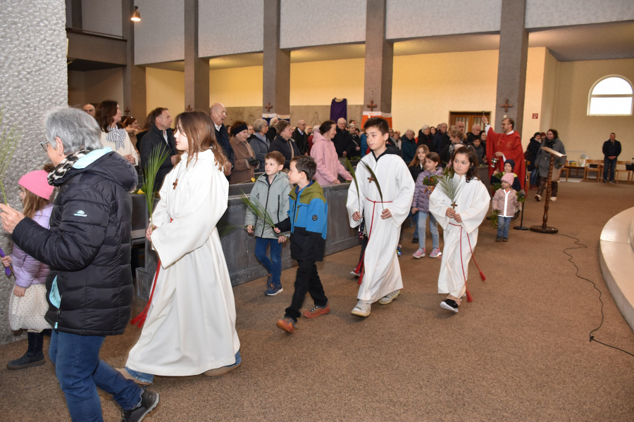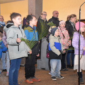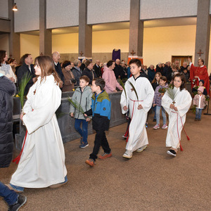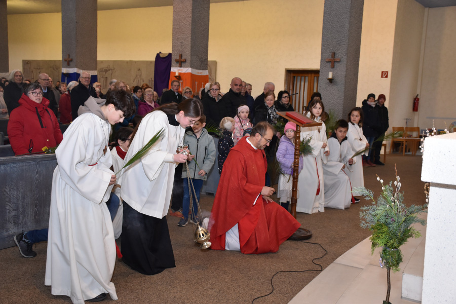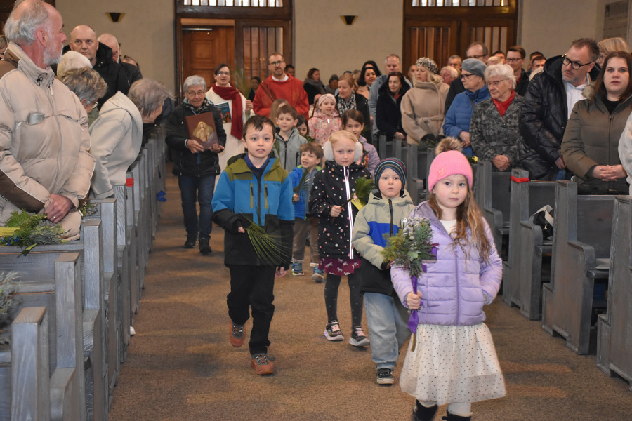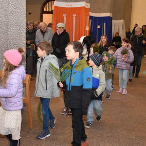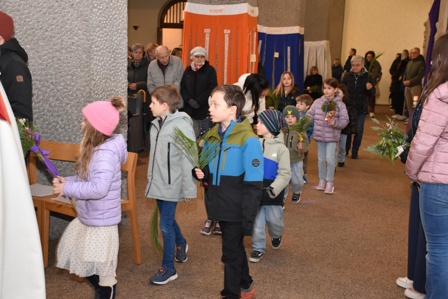 Gemeinsam mit dem Pfarrer und den Ministranten zogen die Kinder in die Kirche ein. Anschließend wurden die Palmzweige und die Palmbuschen geseget.