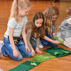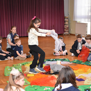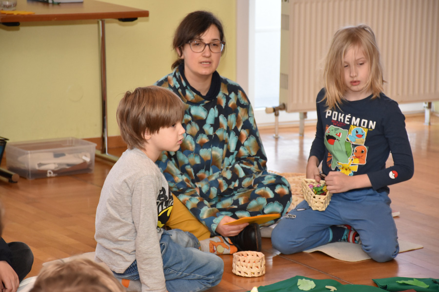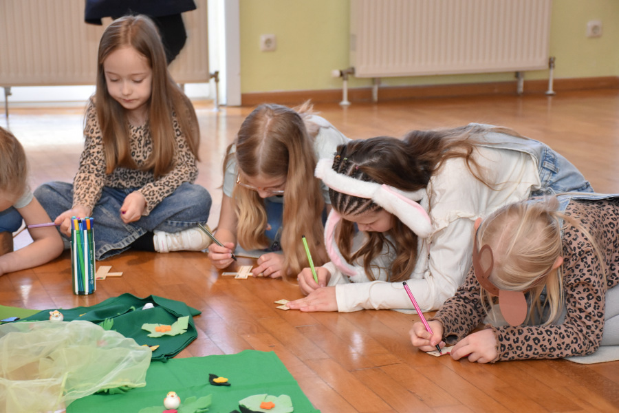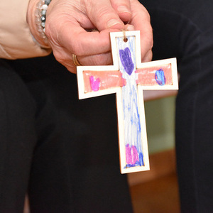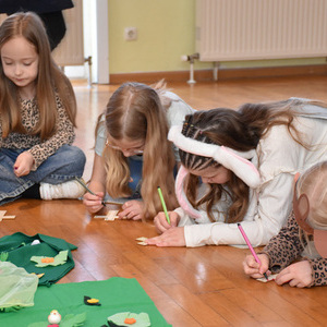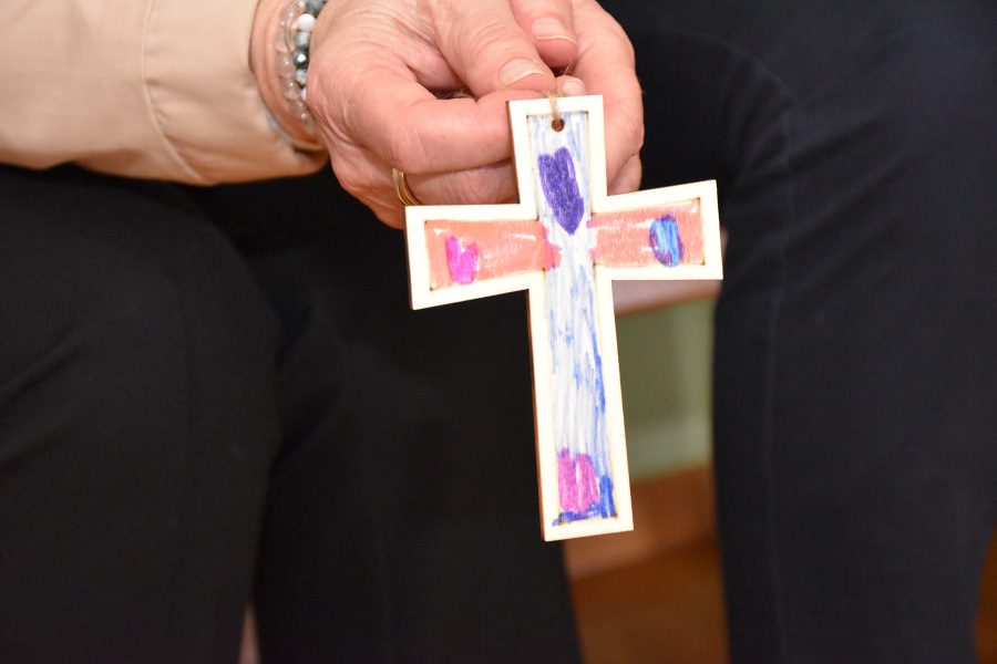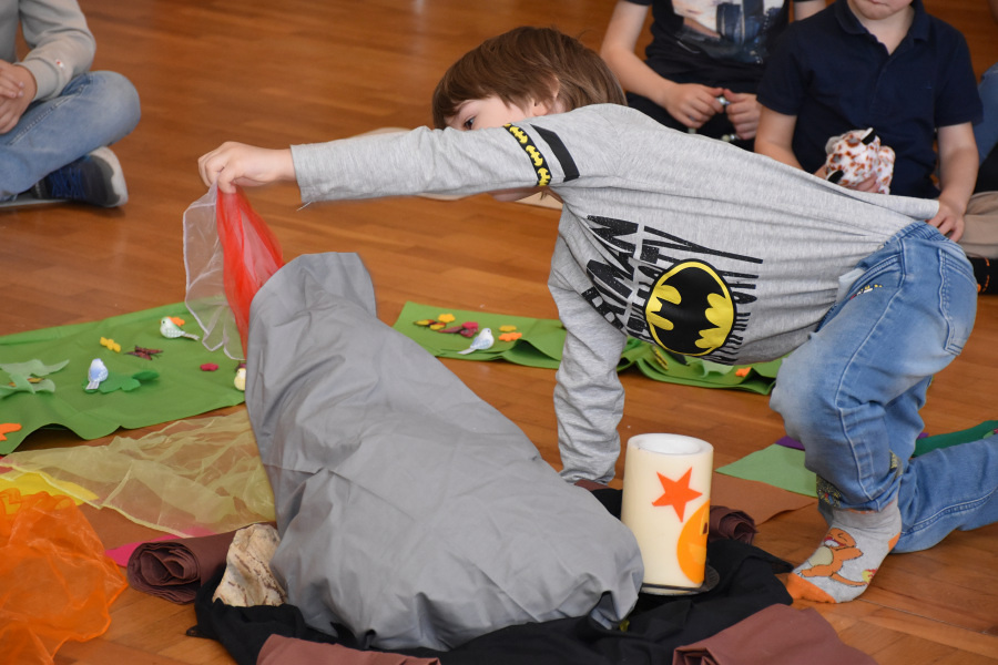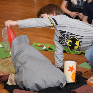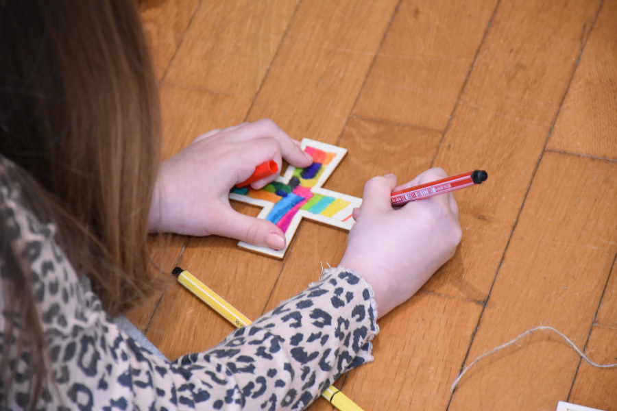 Mit bunten Tüchern, Filzblättern und -blüten legten die Kinder einen Kreis um das leere Grab. Sie bemalten kleine Holzkreuze, die sie mitnehmen durften.