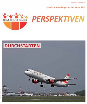 Das Pfarrblatt “Perspektiven” erscheint 4 x jährlich in einer Auflage von 5500 Stück - seit Herbst 2019 in neuem Layout mit erweitertem Inhalt. Neben der theologischen Aufarbeitung des Themas, Veranstaltungshinweisen, Matriken und der Chronik gibt es auch eine Junge Seite, Spirituelles, Mundartgedichte und Kulinarisches für die Leser zu entdecken.