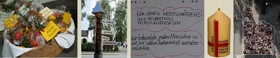 Der Glaube an Gott, an seine Liebe und an seinen Willen, alle Menschen mit dem Heil zu beschenken, bewegt uns, mitten in der Welt seine Botschaft zu leben, zu verkünden und zu feiern. Als Pfarrgemeinde sind wir gesendet und beauftragt, ein sichtbares Zeichen seiner Nähe zu allen, „besonders zu Armen und Bedrängten aller Art“ zu sein.. (GS1). Seine Zusage: „Ich bin bei euch alle Tage bis zum Ende der Welt“ (Mt 28,20) stärkt uns in der Nachfolge Jesu.