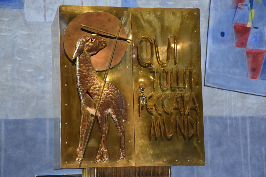 Gestaltet von Hanns Angerbauer, akad. Metallplastiker. Die Altarleuchter und das "Ewige Licht" sowie die Leuchter an den Apostelkreuzen stammen ebenfalls von ihm. (Rechnung v. 20.9.1957)