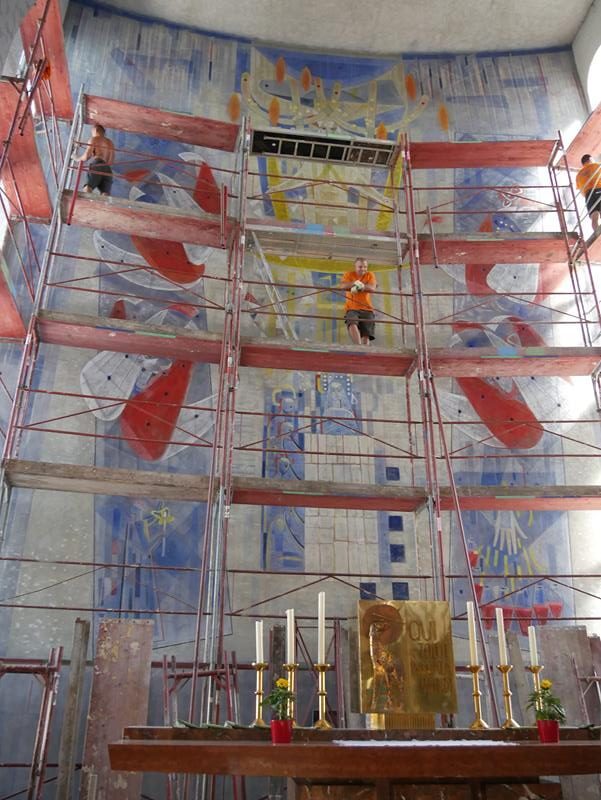 Als das Kircheninnere mit Ausnahme der Wand hinter dem Altar fertig verputzt war machten sich Pfarrer Glas und Pfarrer Macsady auf die Suche nach einem Künstler für das Altarbild.