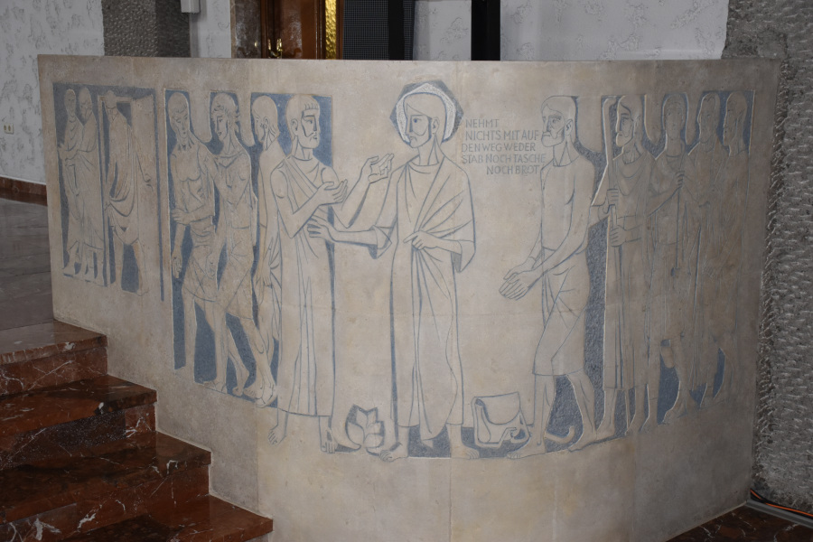Der rechte Ambo ist der Aussendung der Jünger gewidmet. "Nehmt nichts mit auf den Weg, weder Stab, noch Tasche, noch Brot" (Lk 9,3).
