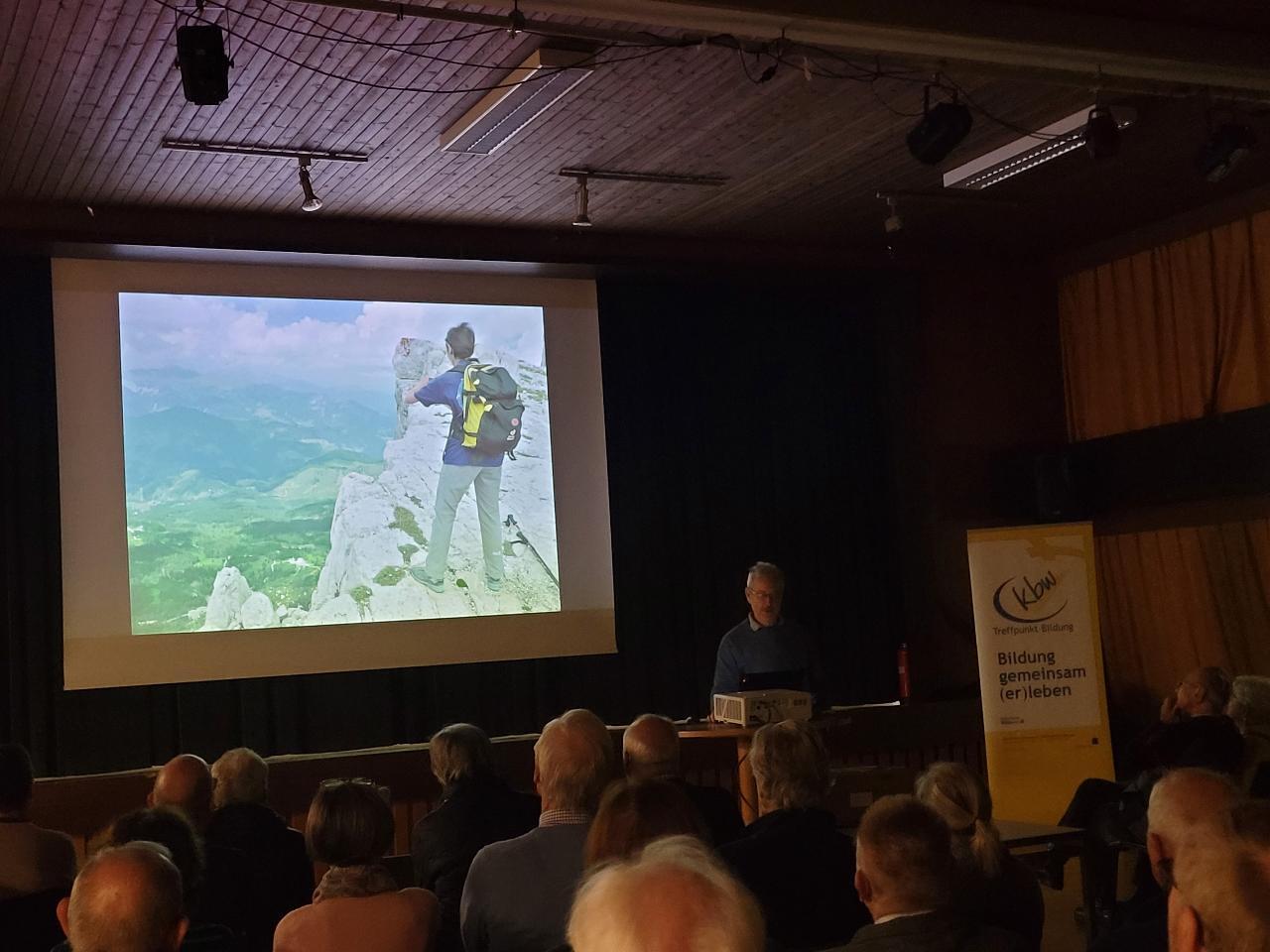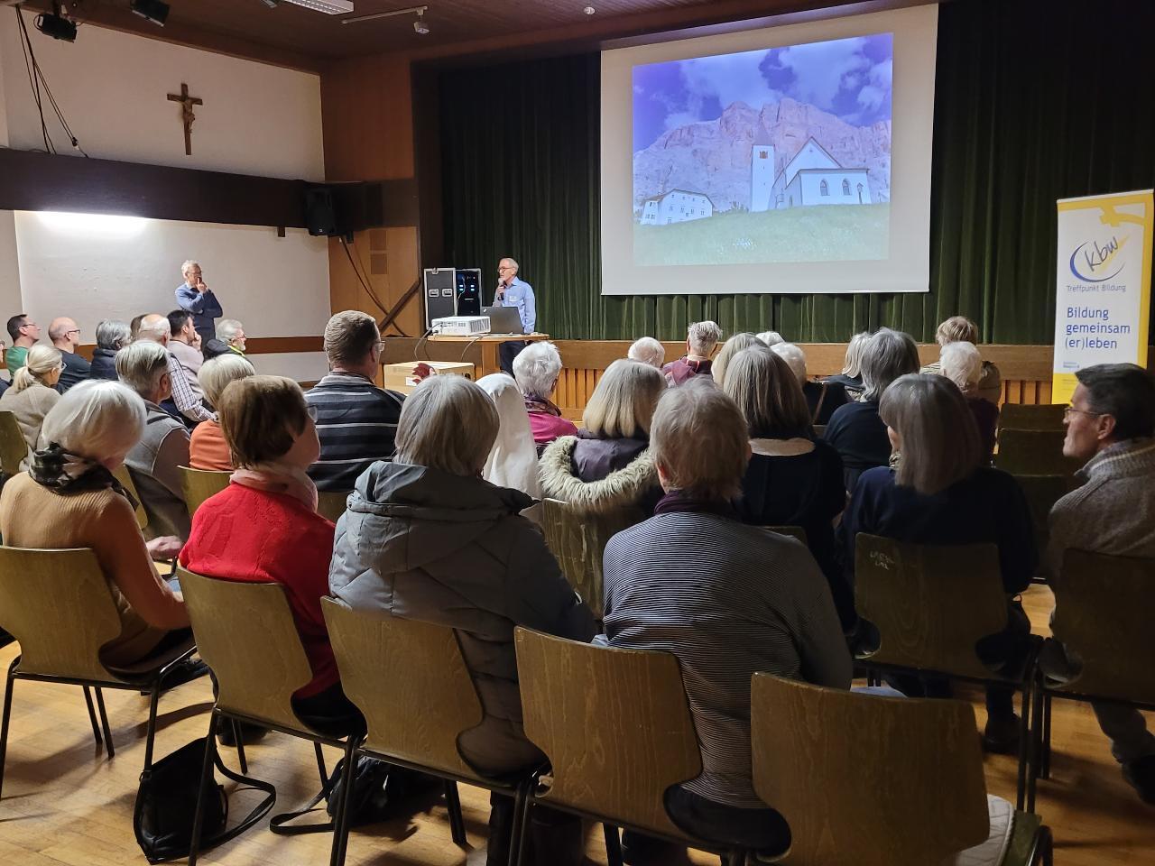 Herr Michael Chalupka führte uns in einer kurzweiligen Präsentation durch die Besonderheiten der wunderbaren Berglandschaften, die den Geburtsort des Heiligen im ladinischen Gadertal wie ein Ring umgeben.