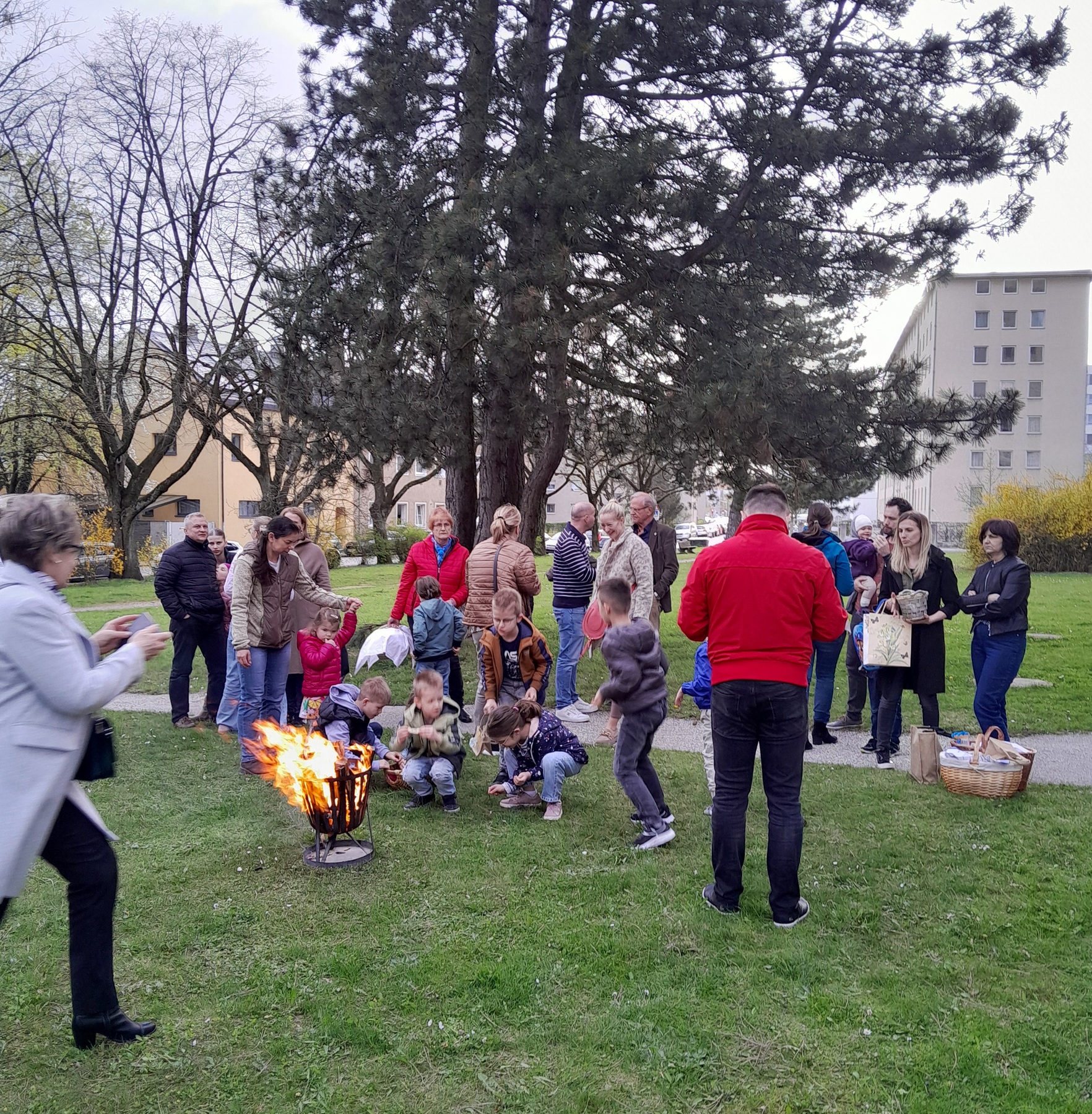 Im Anschluss an die sehr stimmungsvolle Feier gab es noch ein gemütliches Zusammensein bei Fladenbrot rund ums Osterfeuer im Park bei herrlichem Frühlingswetter.