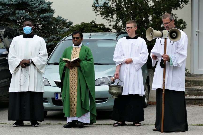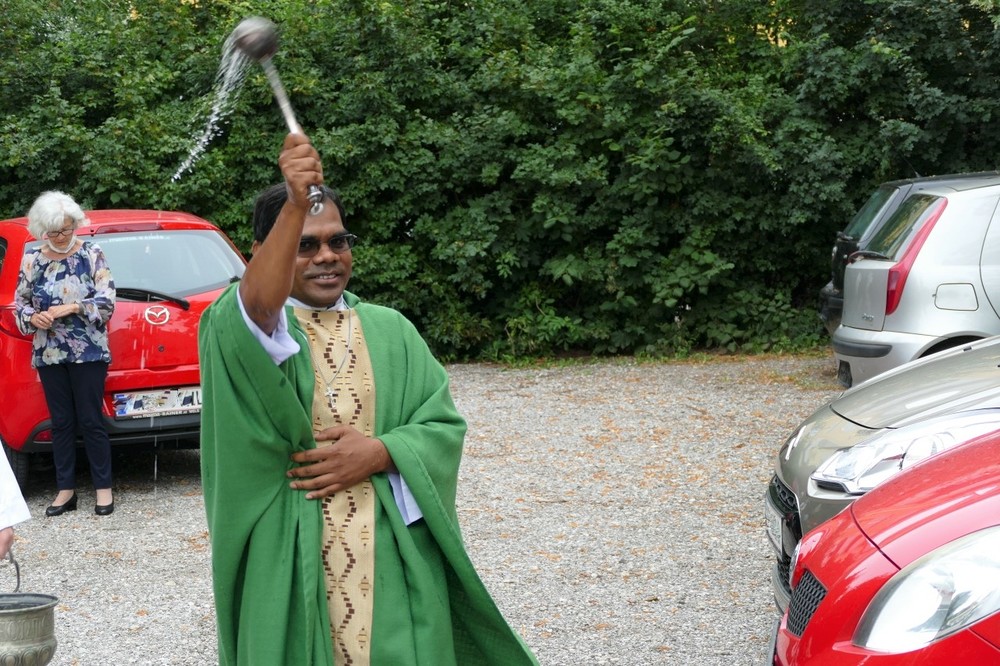 Fahrräder und PKWs wurden gesegnet und um Gottes Schutz im Straßenverkehr gebetet. Ausnahmsweise regnete es heuer erst nach der Segnung.