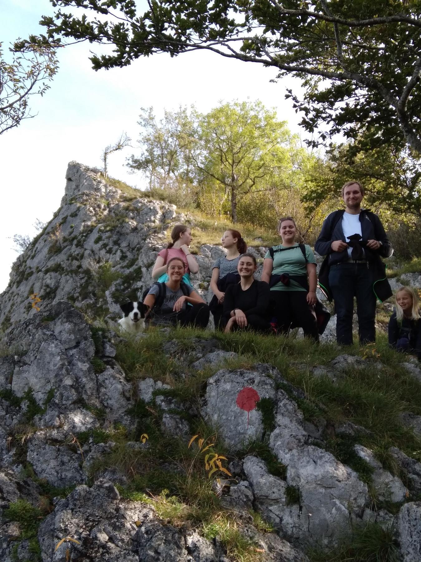Die Gespräche im Zug waren schon angeregt und die hohe Motivation unserer Gruppe spürbar. Dass die Sonne bereits die Berge beleuchtete, machte so manches Augenfunkeln erkennbar. In Scharnstein angekommen marschierten wir Richtung Tießenbachtal los. Das Meisenkögerl ist ein kleiner, aber lohnender Berg in Scharnstein, der zahlreiche Aufstiegsmöglichkeiten aufweist. Unsere Pfarrjugend ist recht bergaffin und zeigte sich motiviert, einen der schwierigeren Wege zu wählen. Also wanderten wir am Grat der Bräumauer entlang – die Bräumauer ist von Scharnstein aus beim Blick Richtung Osten eine gut sichtbare Wand links vom Tießenbachtal – schrieben uns bei kurzer Pause am Bräumauer-Gipfel ins Gipfelbüchlein ein und stiegen weiter Richtung Meisenkögerl-Gipfel. Beim Gipfelanstieg gibt es auch mehrere Möglichkeiten, manche wählten die schwierigere, andere die einfachere Kletterpassage – geklettert wurde aber immer. Unser Begleithund Panda musste über eine größere Stufe getragen werden.
