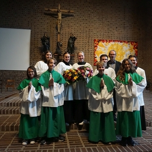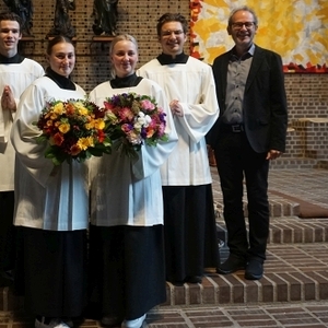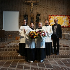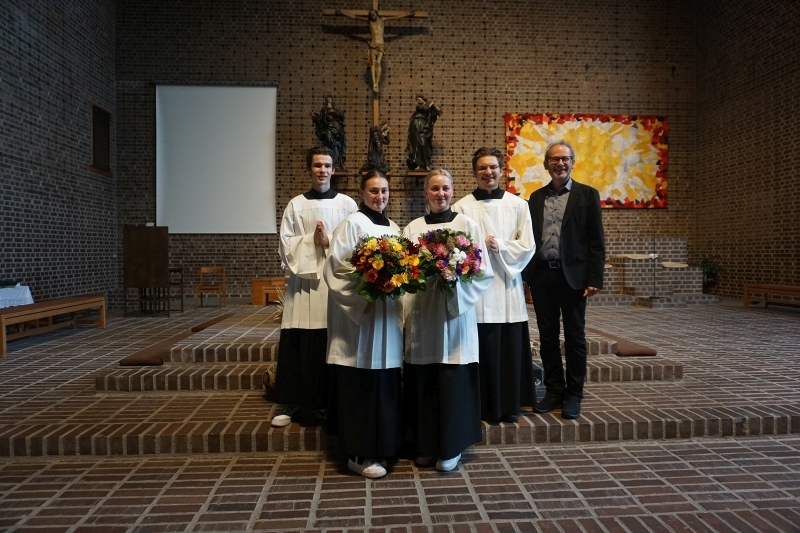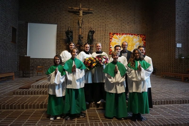 Nach dem Sonntagsgottesdienst am 8.10.2023 dankte Pfarrassistent Hasibeder den scheidenden Ministrant:innen Leiterinnen Klara und Vanessa Panic sehr herzlich für ihre langjährigen Dienst und überreichte Blumen.
