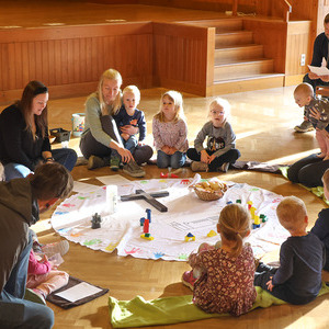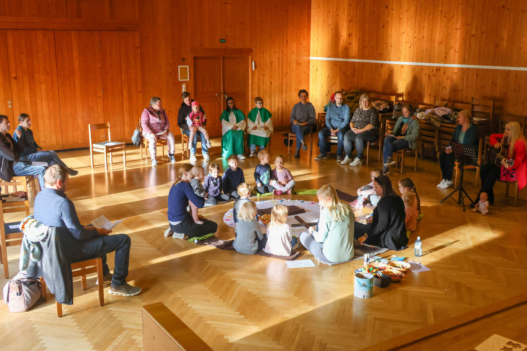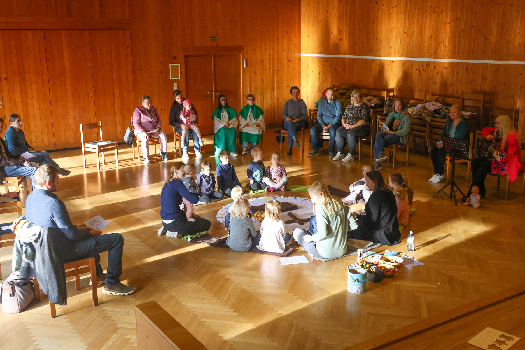Nach einem gemeinsamen Gottesdienstbeginn in der Kirche ging es für die kleinen Wort-Gottes-Feier-Besucherinnen und Besucher in den Josefsaal unseres Pfarrheims. Im Rahmen einer kindgerechten Feier durften die Kinder mit kleinen Bausteinen ihre Häuser nachbauen, im Mittelpunkt unsere Kirche - oder das Haus in dem jemand wohnt, den man aber so nie sieht. Mit den Grundsteinen, die die jungen Gottesdienstbesucherinnen und Besucher bunt gestalten konnten, wurde das Kirchengebäude mit Leben gefüllt.
