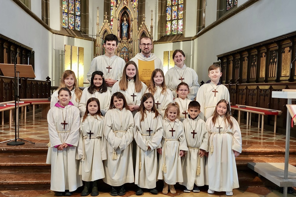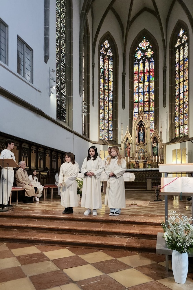 In unserer Pfarre gibt es derzeit mehr als 30 von ihnen. Wir sind sehr dankbar, dass wir die Minis haben, denn ihre Arbeit und ihr Engagement sind aus dem wöchentlichen Gottesdienst nicht mehr wegzudenken. Darum freut es uns umso mehr, dass am 30. April 2023 wieder drei Ministrantinnen in unsere Gemeinschaft aufgenommen wurden - dieses Jahr waren dies Viki, Karoline und Saskia. Alle drei haben 2021 zu ministrieren begonnen und zeigen uns seitdem regelmäßig ihre Freude in der Heiligen Messe und den vielen gemeinsamen Gruppenaktivitäten. Wir wünschen uns, dass wir im Namen Gottes weiterhin ein gutes Team sind, uns noch eine schöne Zeit bevorsteht und, dass wir den Glauben Tag für Tag aufs Neue erleben dürfen.
