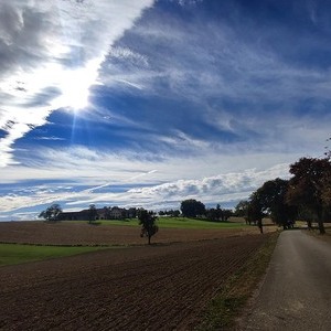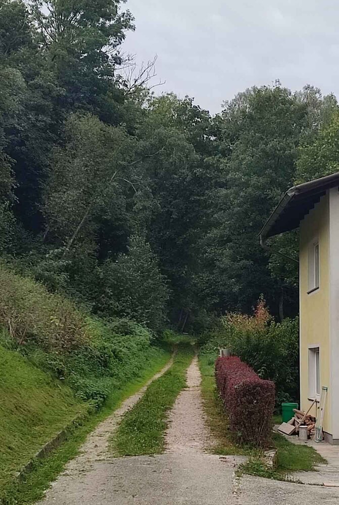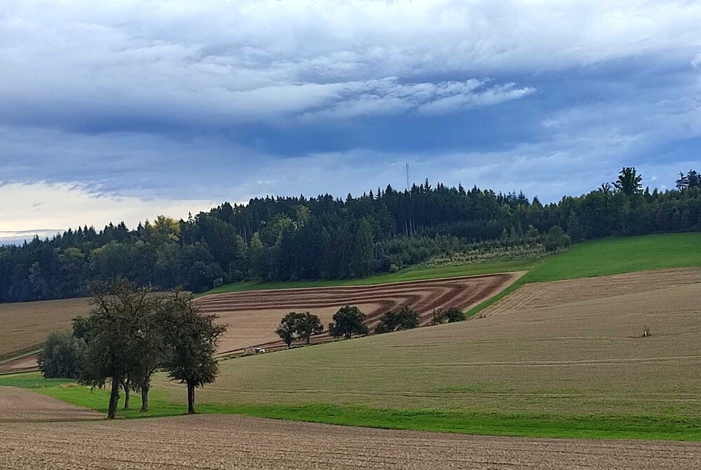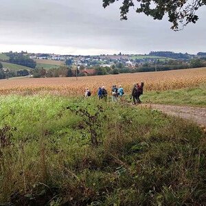 An die Öffnungszeiten des Gasthauses gebunden, drehten wir dieses Mal den Spieß um und gingen zuerst die deutlich kürzere Strecke über den Grieskirchner Kalvarienberg und den Zeileisweg unserem Pilgerziel entgegen. Dabei ergaben sich vom Waldrand bei der Ortschaft Niederndorf schon Ausblicke auf den Rückweg auf der gegenüberliegenden Seite des Tales.