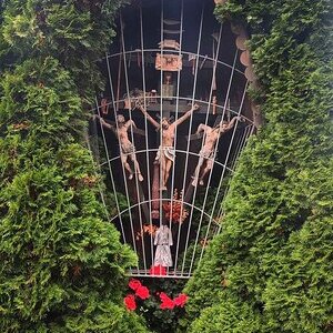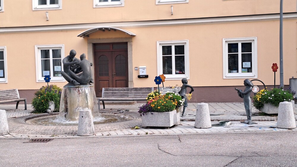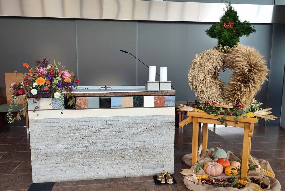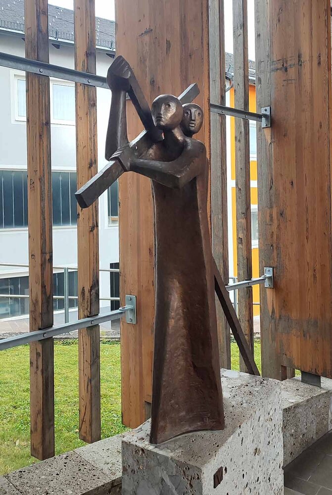 Nach der Einkehr im Wienerhof waren es nur wenige Gehminuten zur Pfarrkirche Gallspach, in der wir unsere Pilgerandacht feierten. Die Kirche wurde im Jahr 2005 neu gebaut und ist der Heiligen Katharina geweiht. Einige Restbestände der alten Kirche, wie der Glockenturm, wurden in den Neubau integriert. Besonders sehenswert ist auch der Kreuzweg, der beim Haupteingang der Kirche beginnt, dem Rundgang folgt und am Ende wieder in den Kirchenraum mündet.