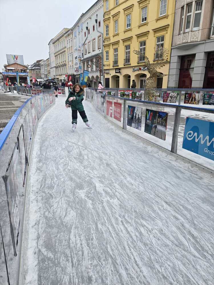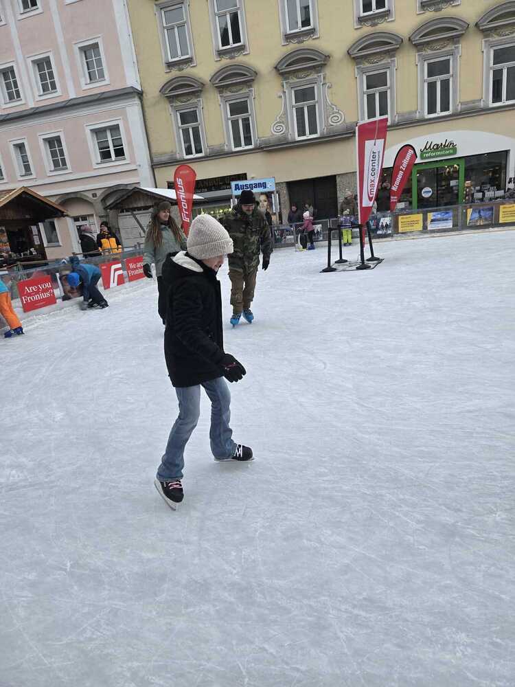 Die Gruppe machte sich am frühen Nachmittag auf den Weg zum „Eis-8er“ am Welser Stadtplatz und zog dort ihre Runden. Gut eingepackt in warme Winterkleidung und stets in Bewegung, war schnell vergessen, dass es draußen bitterkalt war.