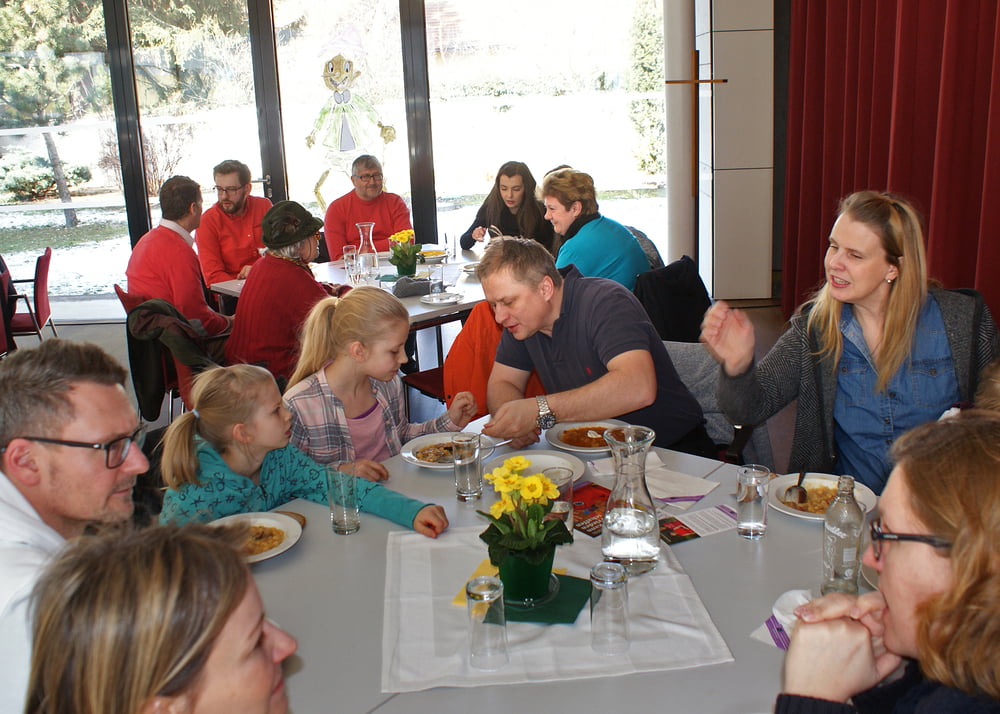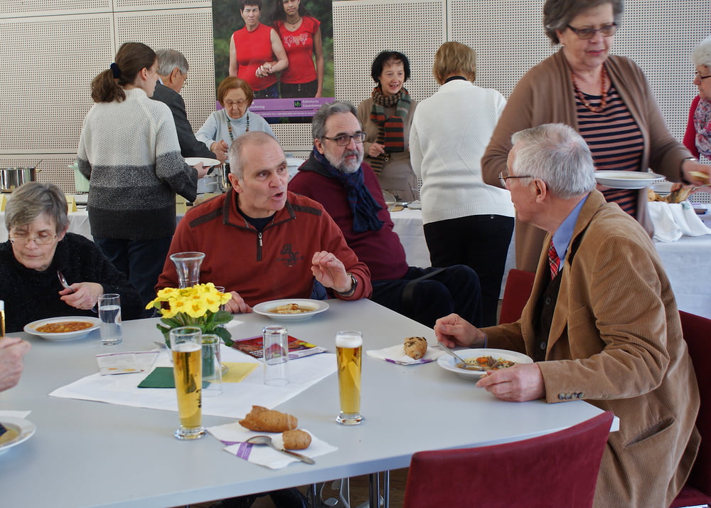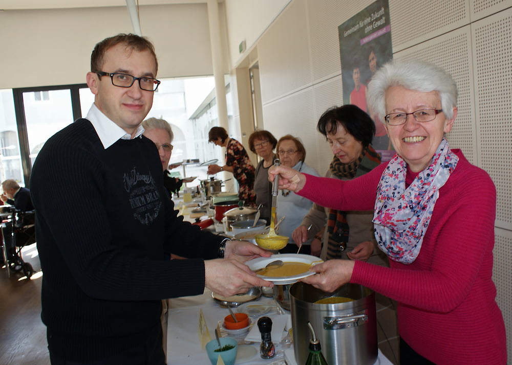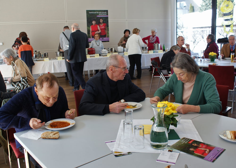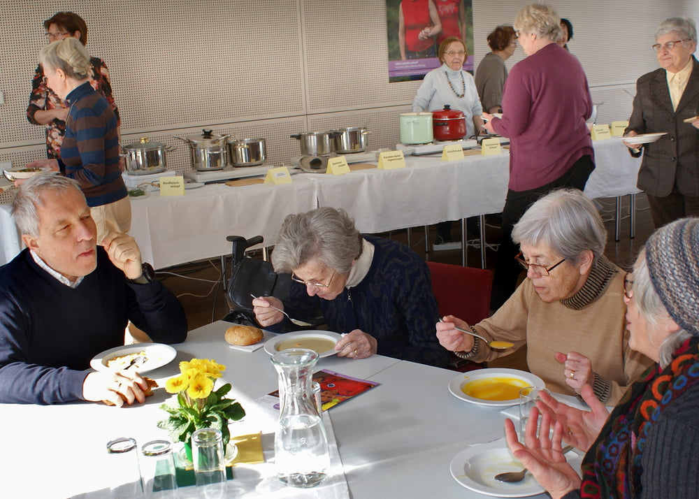 Die herzliche Einladung zum Suppenessen im Pfarrzentrum wurde freudig angenommen und die dampfenden Kochtöpfe gestürmt - sehr zur Freude der 12 SuppenköchInnen. So entstand ein reger Austausch und ein gemütliches Beisammensein.