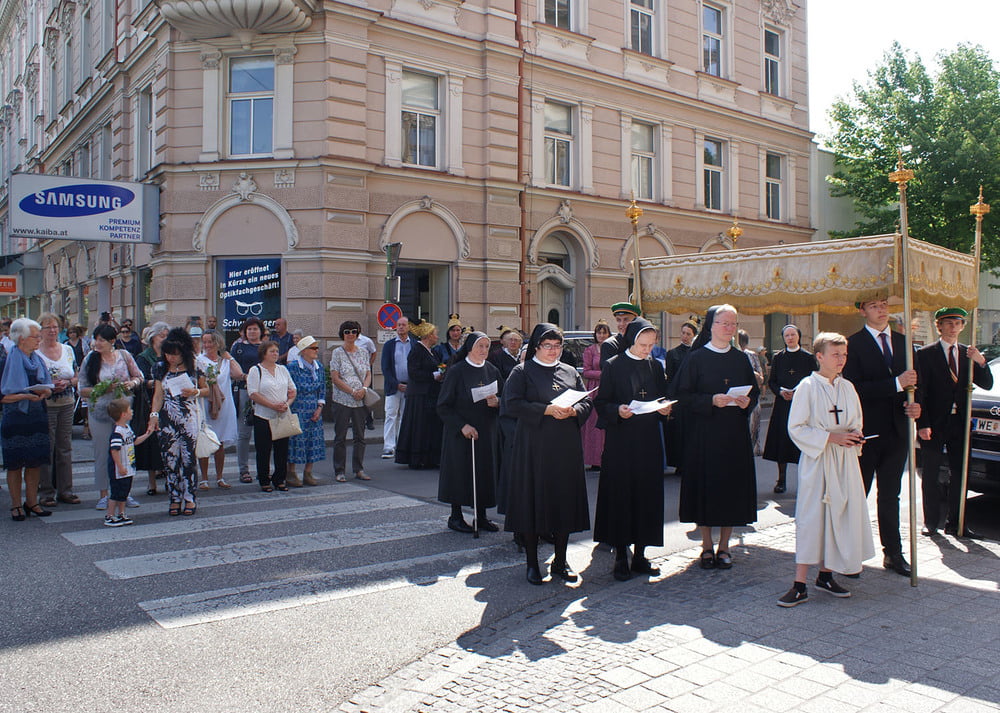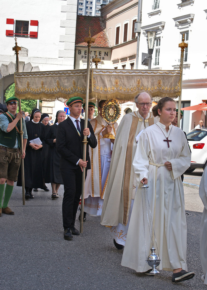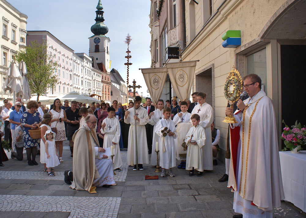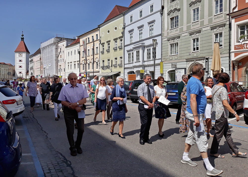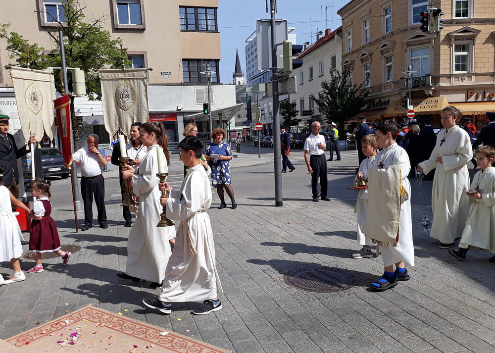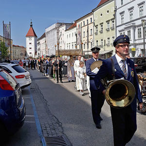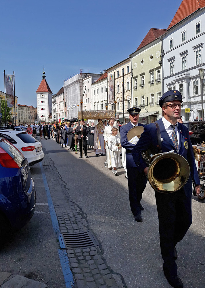 Die anschließende Prozession, angeführt von den Kreuz- und Fahnenträgern und dem Musikverein der Öst. Bundebahnen Wels bewegte sich durch die Pfarrgasse, über die Ringstraße, die Pollheimerstraße und über den Stadtplatz zurück zur Kirche. Durch die große Zahl an Teilnehmern wurde sie zu einem beeindruckenden Glaubenszeugnis. Im Zentrum Pfarrer Niko Tomic mit der Monstranz unter dem Himmel, den Miglieder der Kath. Studentenverbindung getragen haben. Die Feiergemeinde machte an vier Stationen Halt. Die von der KMB, KFB, den Orden und dem Kartellverband vorbereiteten Altäre luden zu Gebet und Betrachten einer Bibelstelle ein, wobei auch die Kinder ihren Platz hatten. Das Festgeheimnis, dass Christus in der konsekrierten Hostie allezeit bei uns ist und uns auch im Alltag in jeder Situation begleitet, vertieften die einzelnen Bibelstellen, Lieder und Gebete.