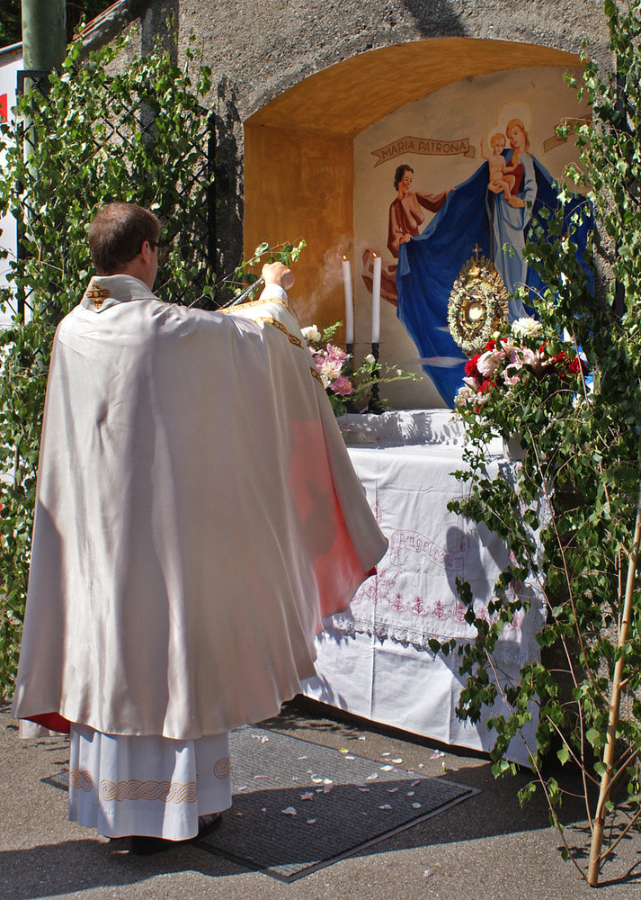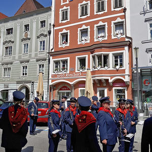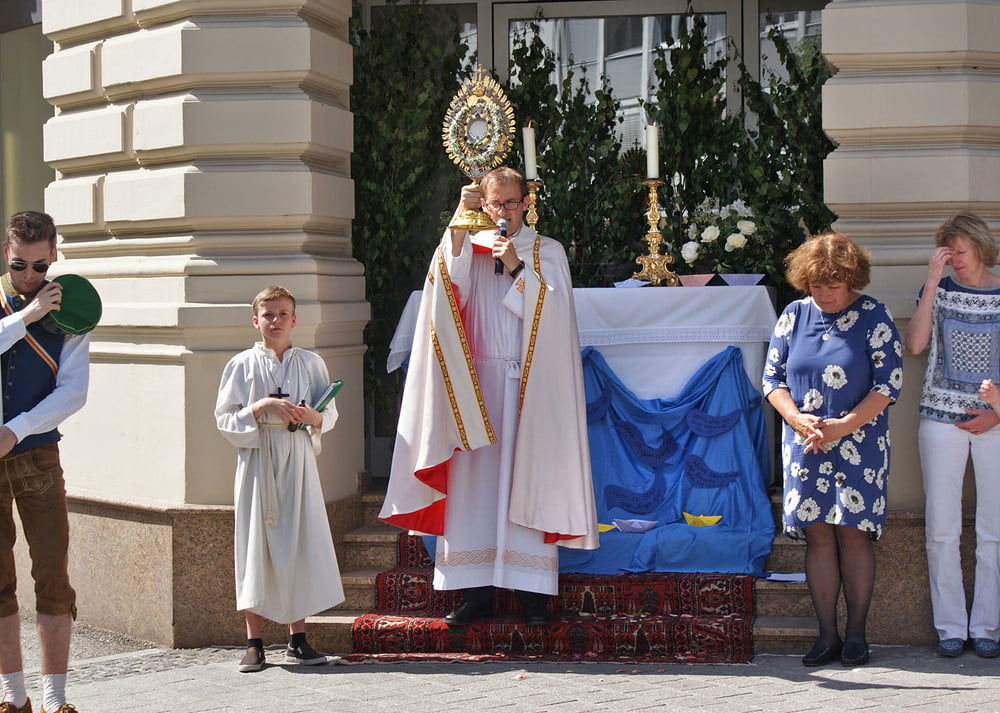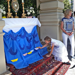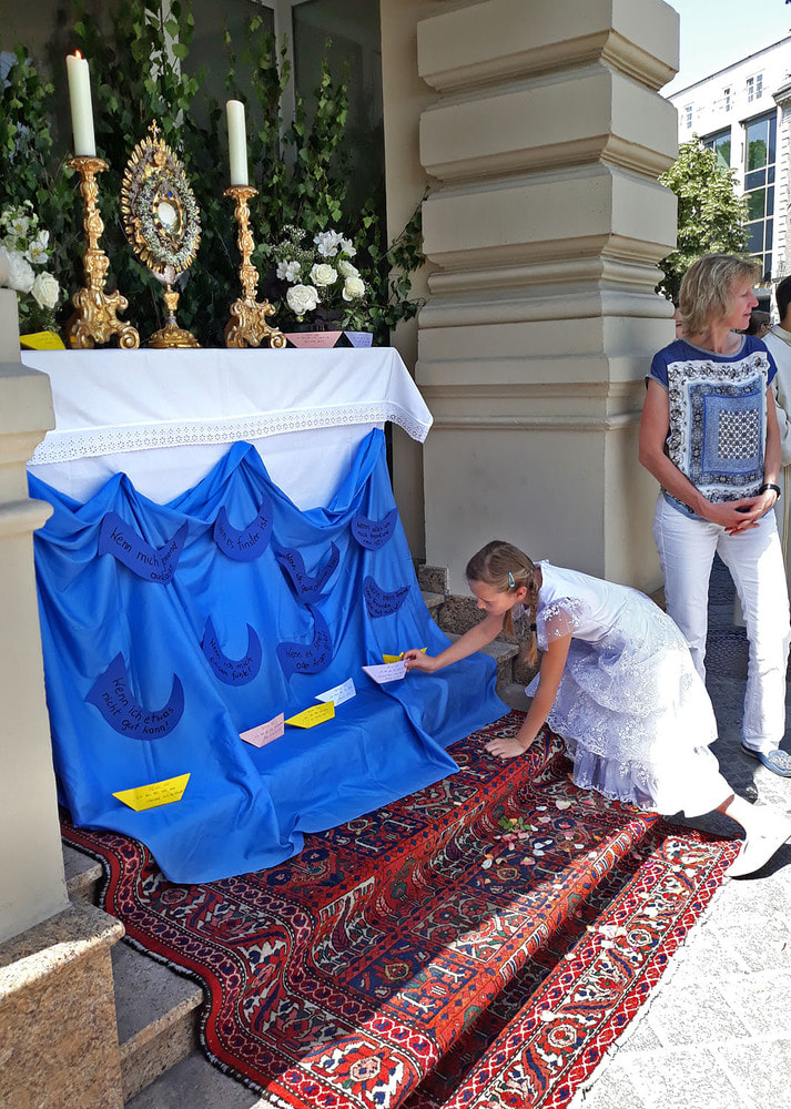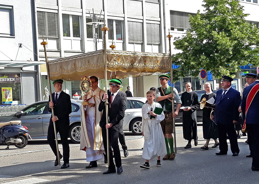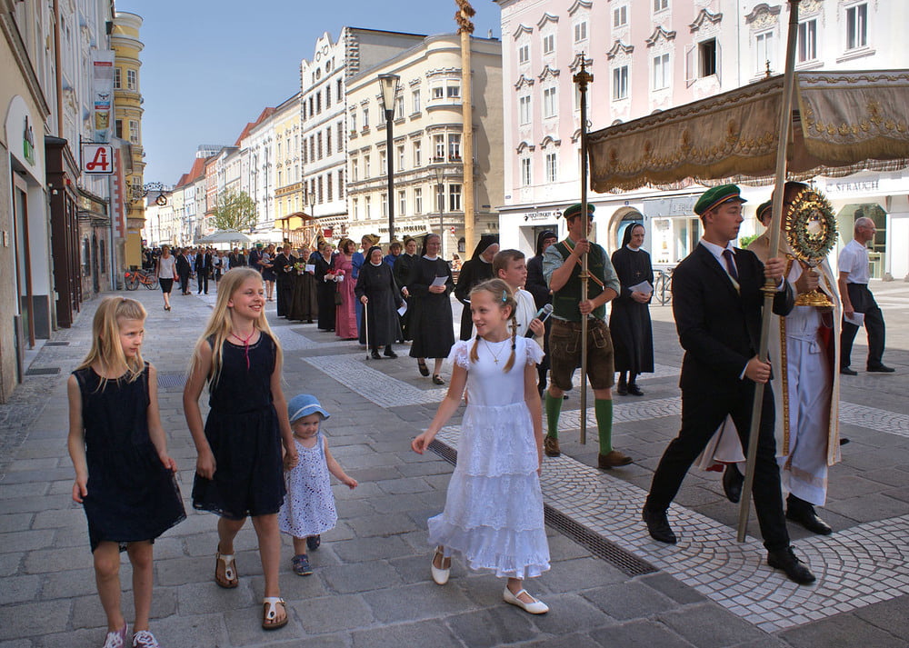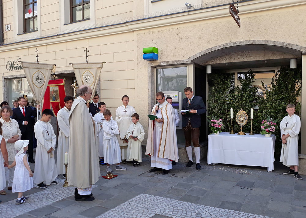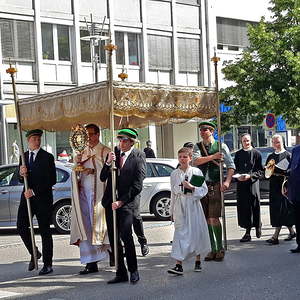 Die anschließende Prozession, angeführt von den Kreuz- und Fahnenträgern und dem Musikverein der Öst. Bundebahnen Wels bewegte sich durch die Pfarrgasse, über die Ringstraße, die Pollheimerstraße und über den Stadtplatz zurück zur Kirche. Durch die große Zahl an Teilnehmern wurde sie zu einem beeindruckenden Glaubenszeugnis. Im Zentrum Pfarrer Niko Tomic mit der Monstranz unter dem Himmel, den Miglieder der Kath. Studentenverbindung getragen haben. Die Feiergemeinde machte an vier Stationen Halt. Die von der KMB, KFB, den Orden und dem Kartellverband vorbereiteten Altäre luden zu Gebet und Betrachten einer Bibelstelle ein, wobei auch die Kinder ihren Platz hatten. Das Festgeheimnis, dass Christus in der konsekrierten Hostie allezeit bei uns ist und uns auch im Alltag in jeder Situation begleitet, vertieften die einzelnen Bibelstellen, Lieder und Gebete.