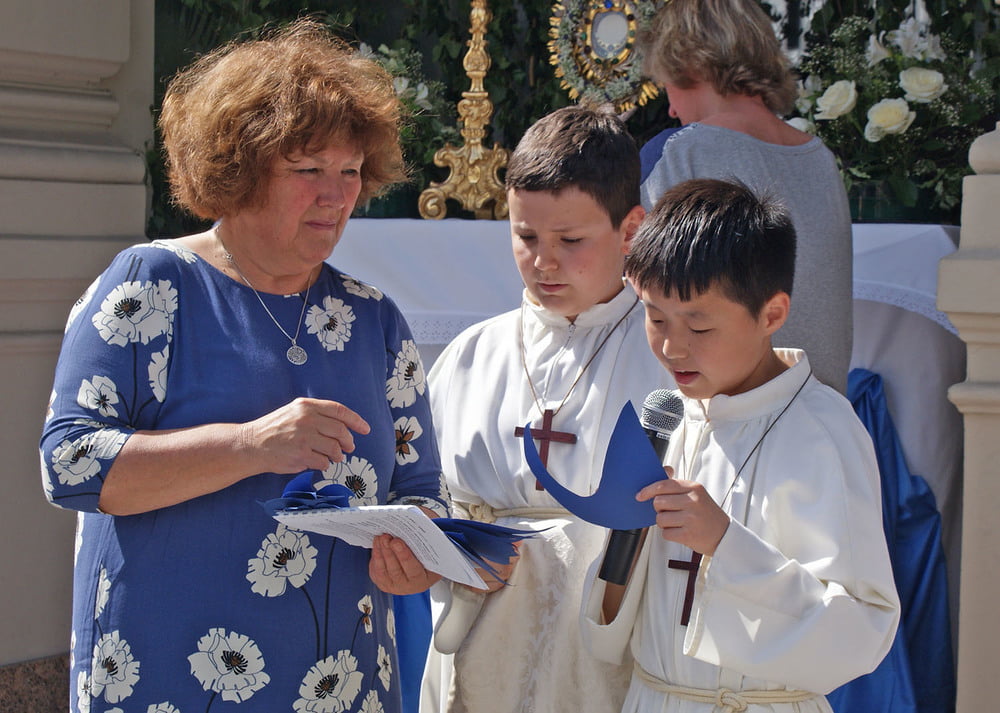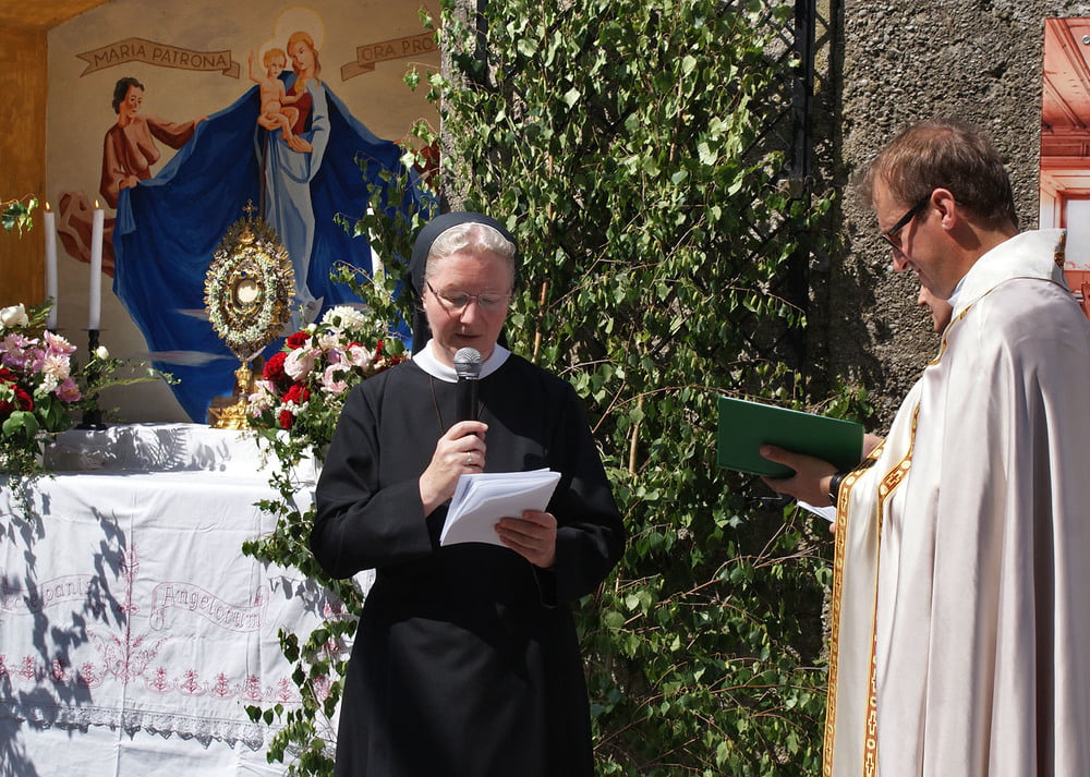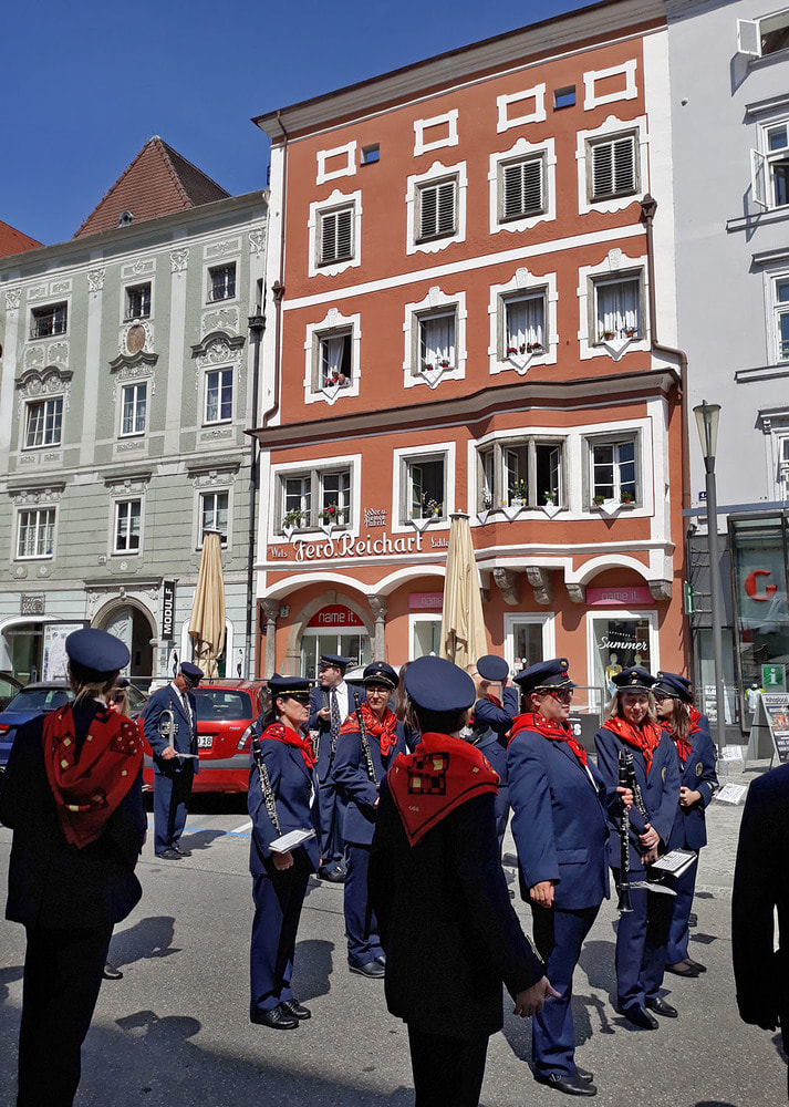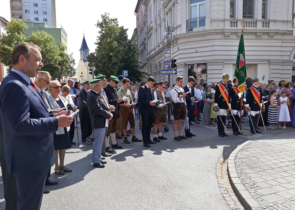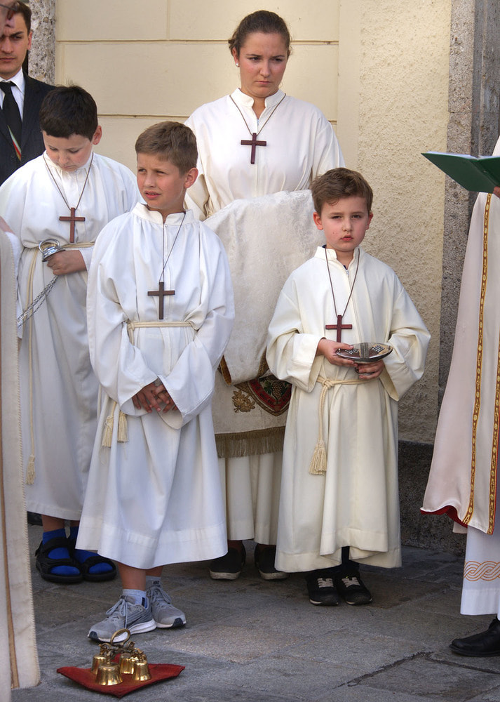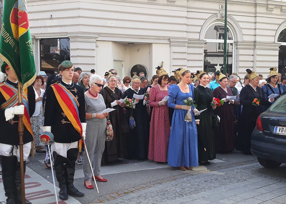 Die anschließende Prozession, angeführt von den Kreuz- und Fahnenträgern und dem Musikverein der Öst. Bundebahnen Wels bewegte sich durch die Pfarrgasse, über die Ringstraße, die Pollheimerstraße und über den Stadtplatz zurück zur Kirche. Durch die große Zahl an Teilnehmern wurde sie zu einem beeindruckenden Glaubenszeugnis. Im Zentrum Pfarrer Niko Tomic mit der Monstranz unter dem Himmel, den Miglieder der Kath. Studentenverbindung getragen haben. Die Feiergemeinde machte an vier Stationen Halt. Die von der KMB, KFB, den Orden und dem Kartellverband vorbereiteten Altäre luden zu Gebet und Betrachten einer Bibelstelle ein, wobei auch die Kinder ihren Platz hatten. Das Festgeheimnis, dass Christus in der konsekrierten Hostie allezeit bei uns ist und uns auch im Alltag in jeder Situation begleitet, vertieften die einzelnen Bibelstellen, Lieder und Gebete.