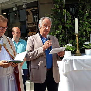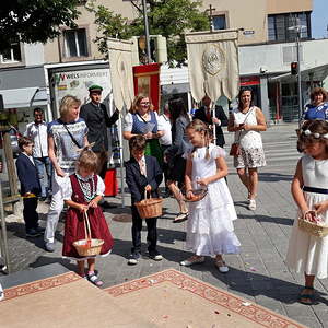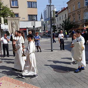 Das Fronleichnamsfest wurde eröffnet mit einem Festgottesdienst unter der Leitung unseres Pfarrers Mag. Niko Tomic und Kurat Karl Kirchweger, musikalisch gestaltet von Bläsern der Eisenbahnermusikkapelle unter der Leitung von Wolfgang Homar, an der Orgel Verena Homar.