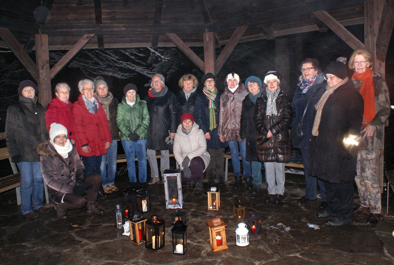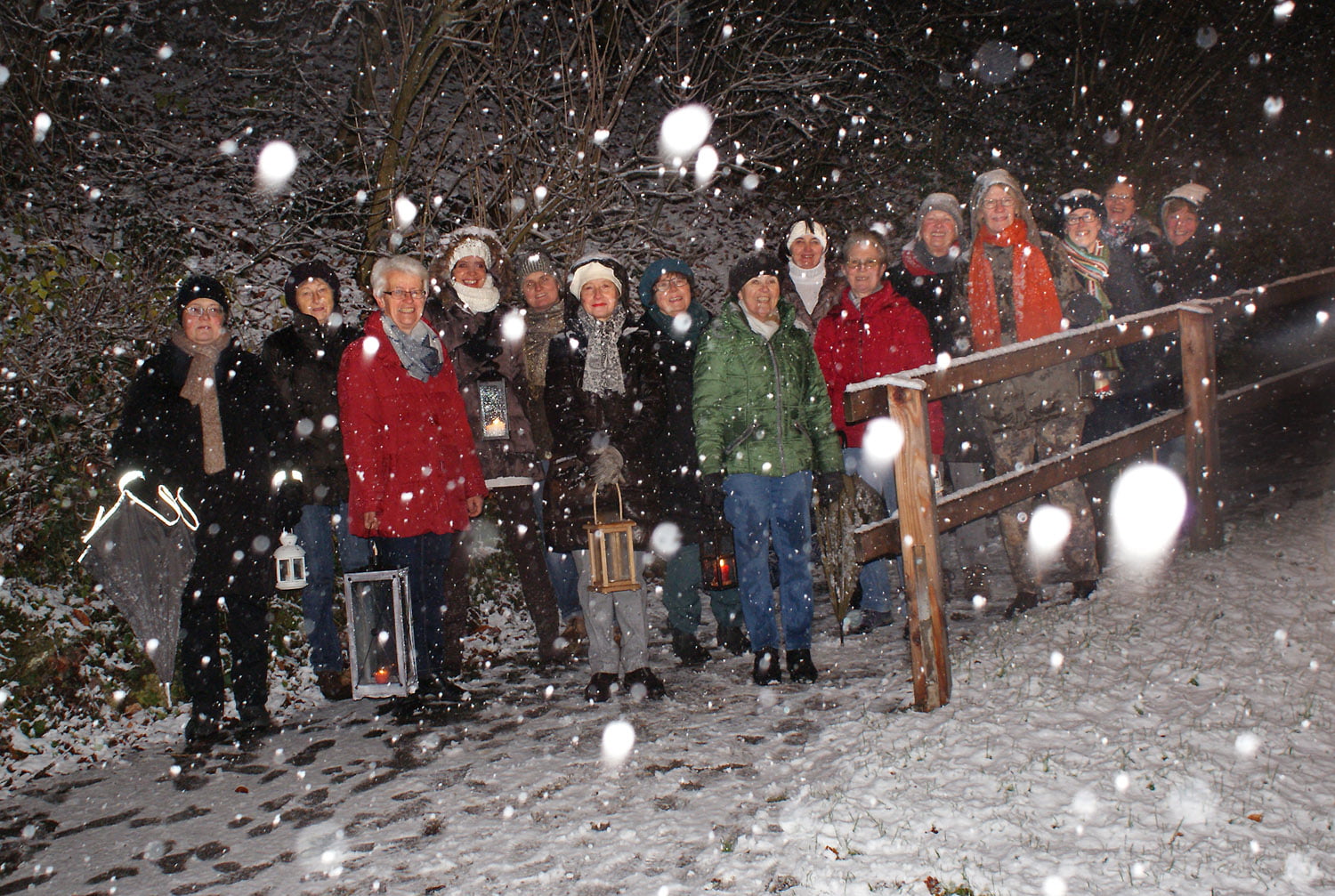 Am Mittwoch, 12. Dezember um 18.30 war es wieder so weit. Die Kerzen in den Laternen wurden entzündet und eine Gruppe von 16 Frauen machte sich beim gerade einsetzenden heftigen Schneefall, winterfest ausgerüstet, auf den Weg durch den herrlich verschneiten Burggarten, entlang des Mühlbachs, über die Traunbrücke zur Vierzehn Nothelferkapelle am Fuß des Reinbergs.