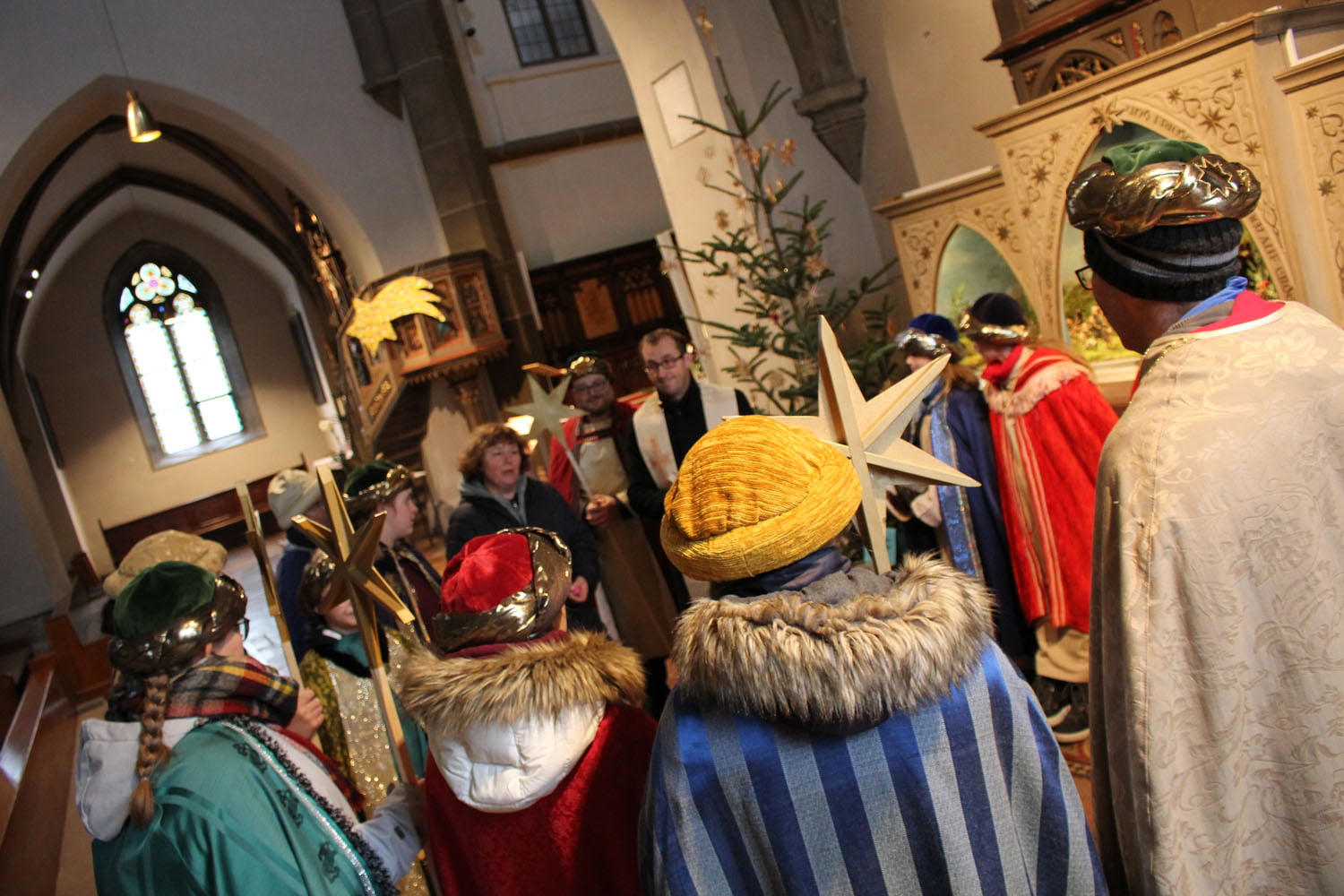 Als alle verkleidet und geschminkt waren, ging es nach dem obligaten Gruppenfoto vor dem Pfarrzentrum in die Kirche, wo unser Herr Pfarrer die 'Heiligen drei Könige' vor der Krippe sendete.