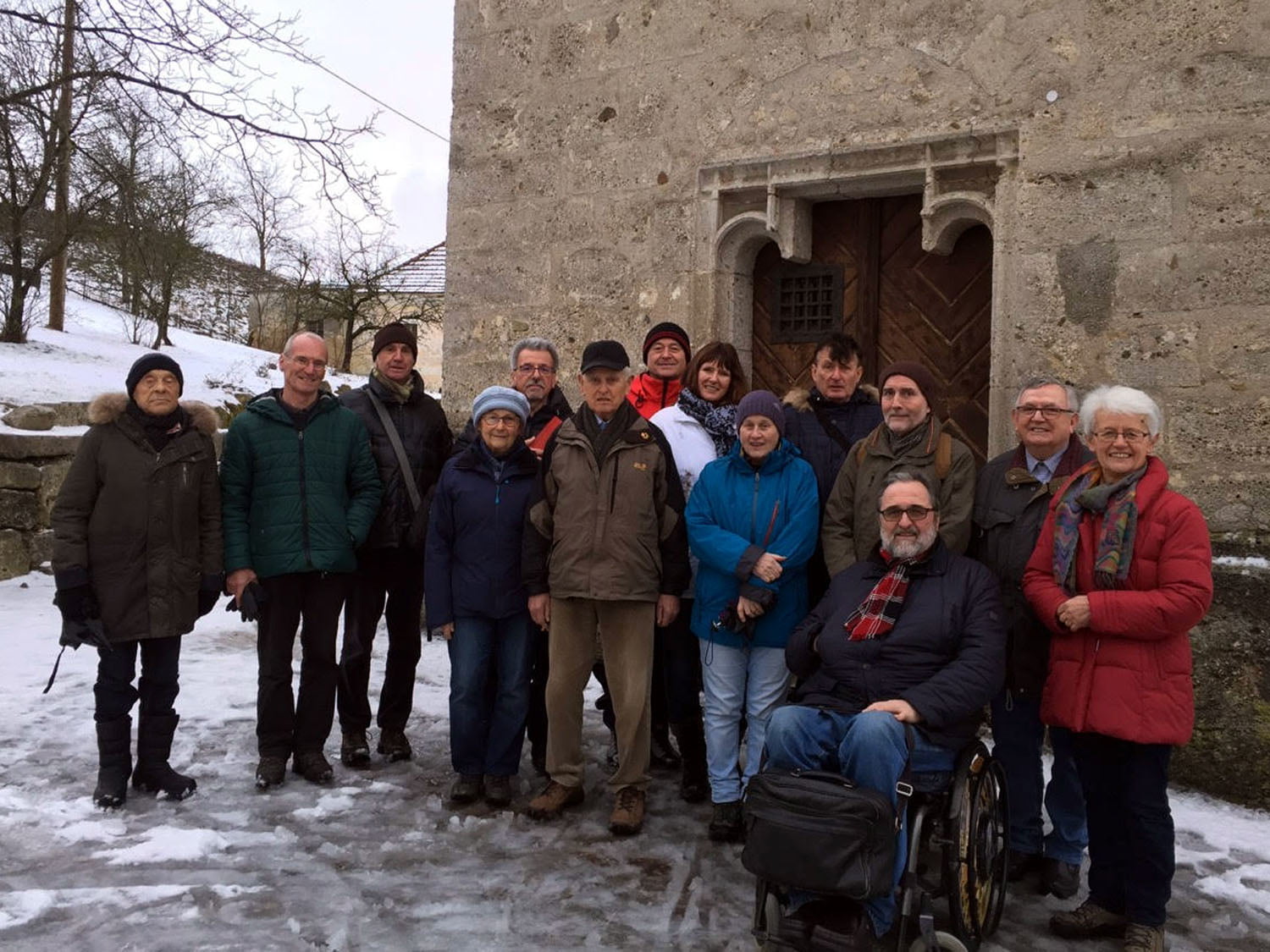 Bei leichtem Schneefall starteten wir um 13:30 in Leombach durch den verschneiten Winterwald. Auf Feldwegen und zuletzt auf der Landstraße erreichten wir um 14:40 die Kirche Leombach.