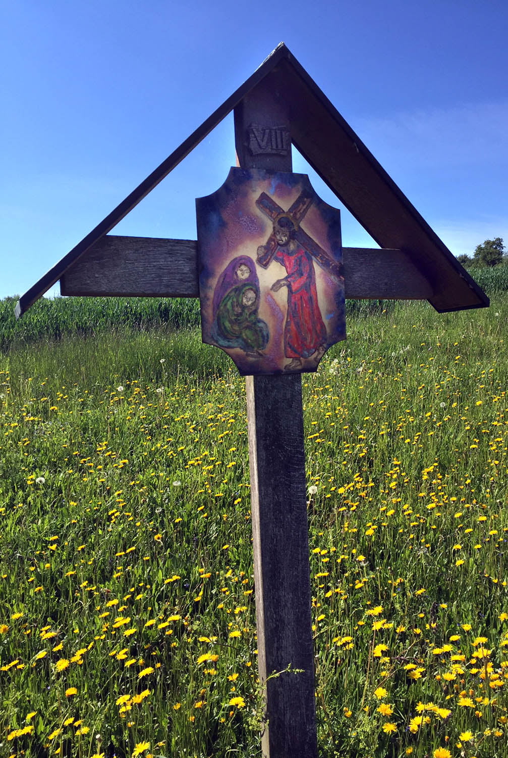 Der Weg führte anfangs sanft bergan, links und rechts säumten üppige Blumenwiesen den Pfad, dazwischen lagen Getreidefelder, ab und zu ein Maisfeld. An 3 Stationen wurde Halt gemacht, Texte und Lieder lenkten unsere Gedanken immer wieder auf neue Seiten unseres Lebens, unseres Da-seins. Im Schweigen, Lachen und Reden setzten wir Schritt für Schritt, getreu dem Motto 'Zeit, zu leben.'
