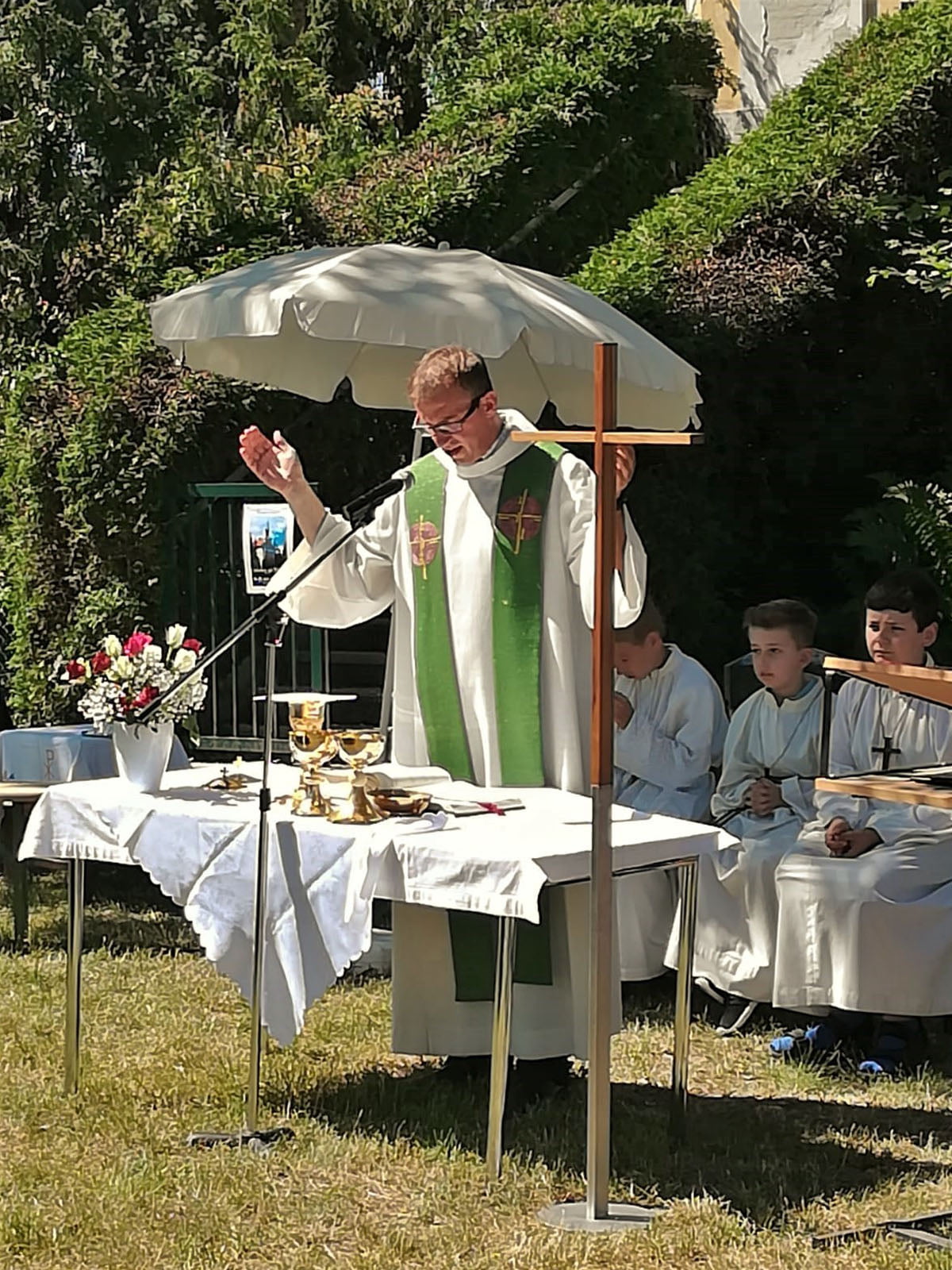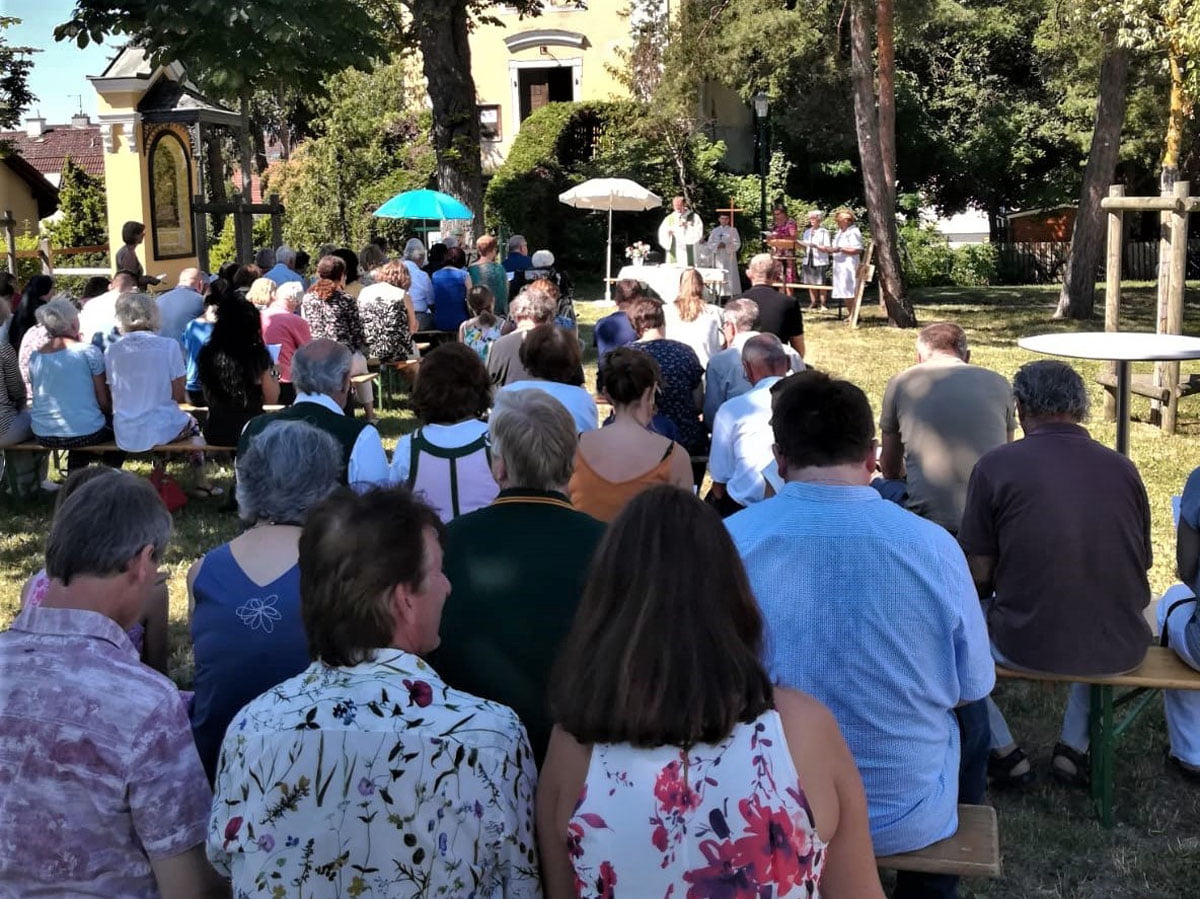 Am Sonntag, den 30. Juni feierten wir den Gottesdienst um 10:30 Uhr im Park vor der Kalvarienbergkirche. Dass diese Feldmesse nun bereits Tradition hat, zeigte sich auch heuer am guten Besuch. Viele Erwachsene und Kinder waren der Einladung gefolgt.