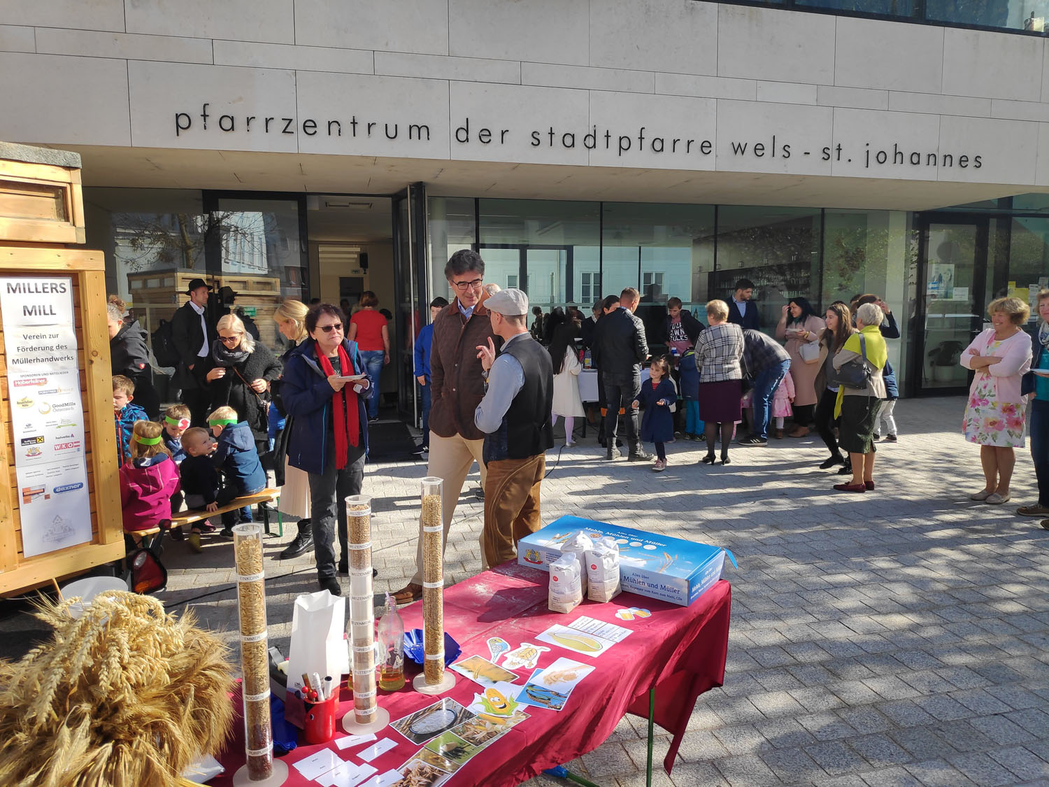 Nach dem Gottesdienst waren noch alle ins Pfarrzentrum eingeladen. Herr Karl Lengauer hatte seine mobile Schaumühle vor dem Pfarrzentrum aufgestellt und die Kinder waren eingeladen ihr eigenes Mehl zu mahlen. Dazu konnten gleich frisch zubereitete Waffeln, ob süß oder sauer, verkostet werden.
