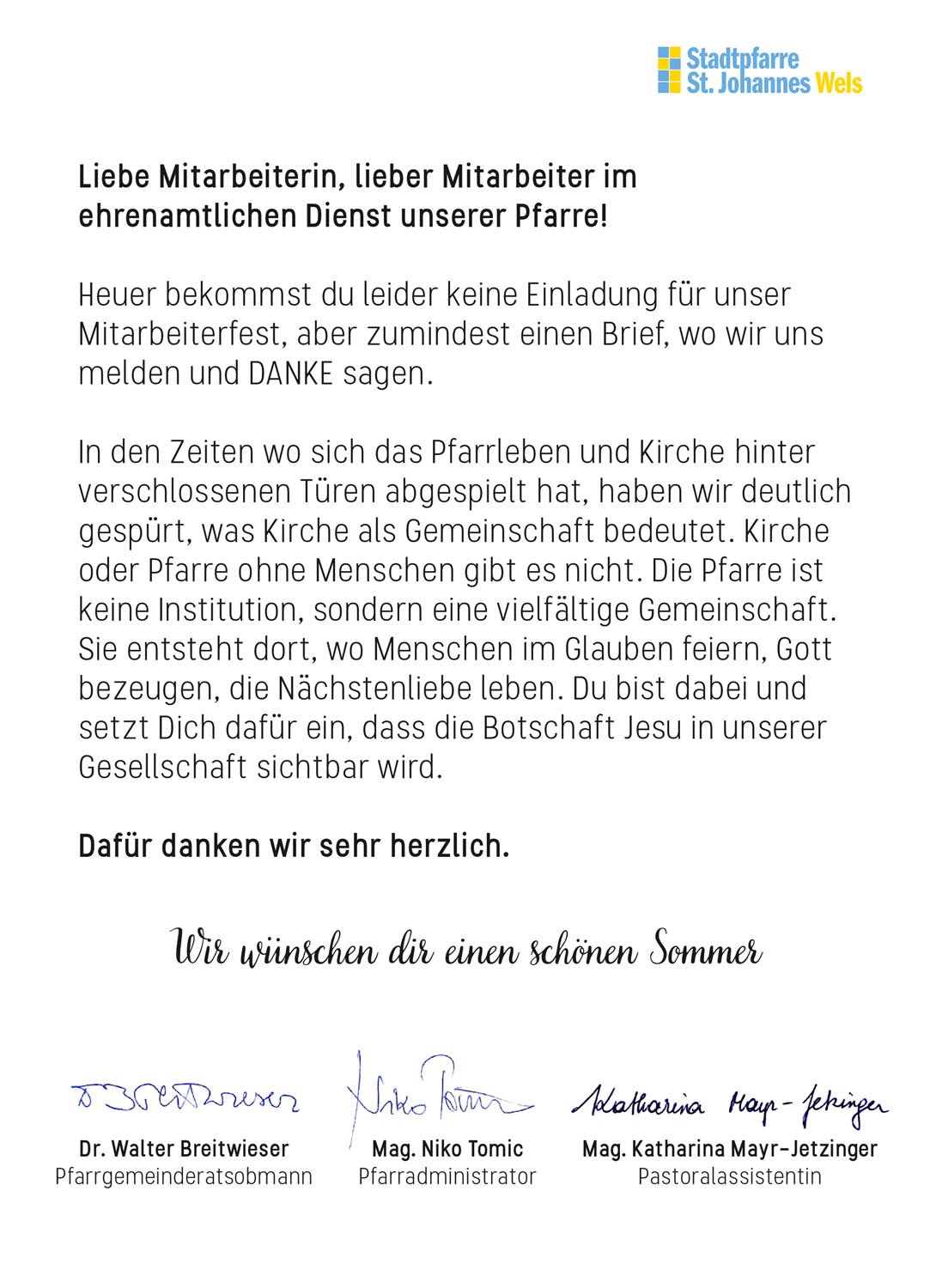 Heuer fand aufgrund der angespannten Lage kein Mitarbeiterfest statt. Trotzdem fand jeder ehrenamtliche Helfer ein Dankeschön im Briefkasten.