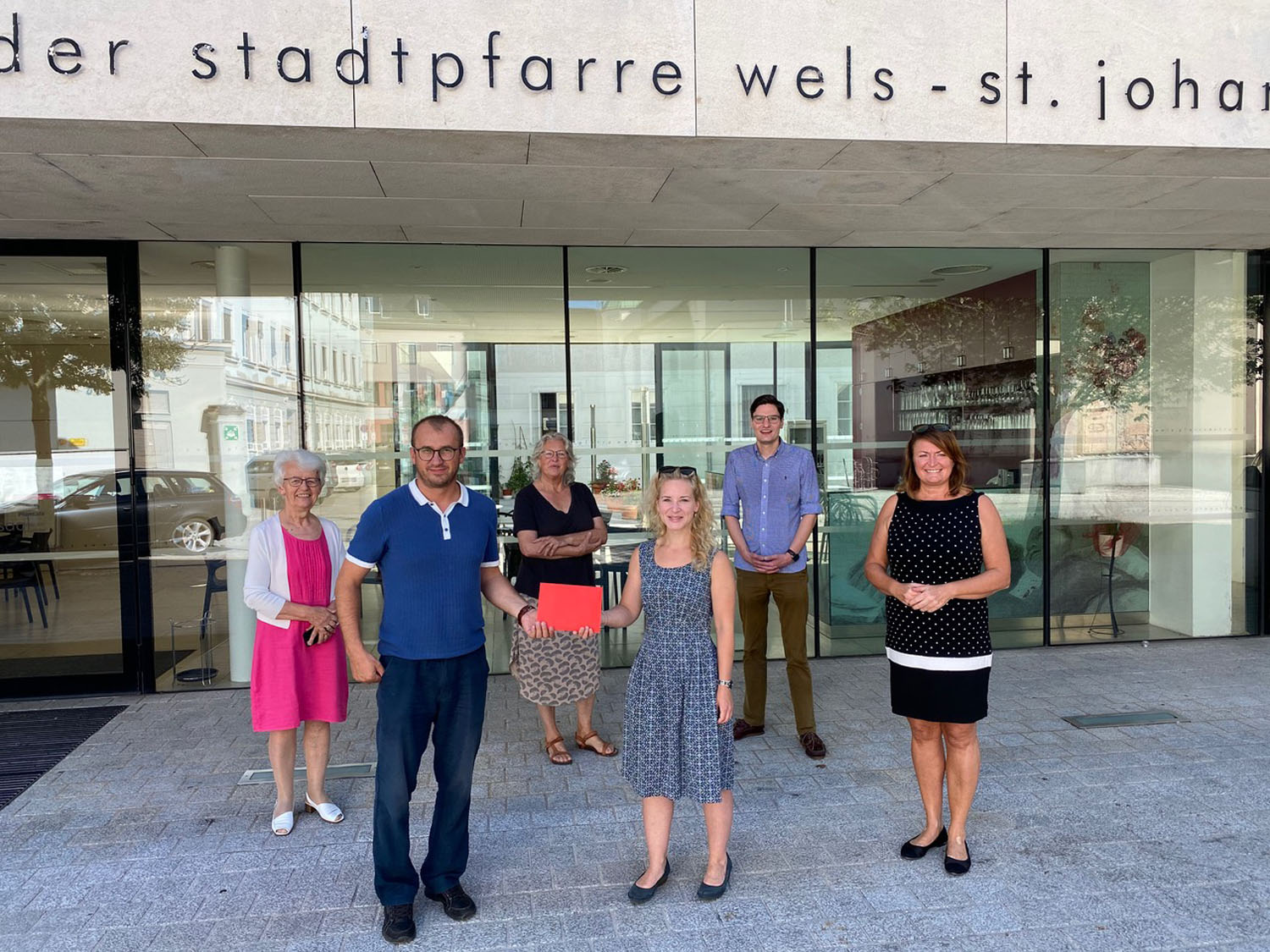 Mit Freude und Dankbarkeit durfte Pfarradm. Mag. Niko Tomic, begleitet von Maria Monitzer und Gertrude Pallanch (Ltg. Caritasfachausschuss Stadtpfarre St. Johannes), am 21. August Lebensmittelgutscheine von den InitiatorInnen von 'Mein Beitrag für Wels' entgegennehmen. Sie wurden von Eva Holzleitner, Abg. z. NR, im Beisein von Petra Wimmer, Abg. z. NR und Gemeinderat Stefan Ganzert überreicht.