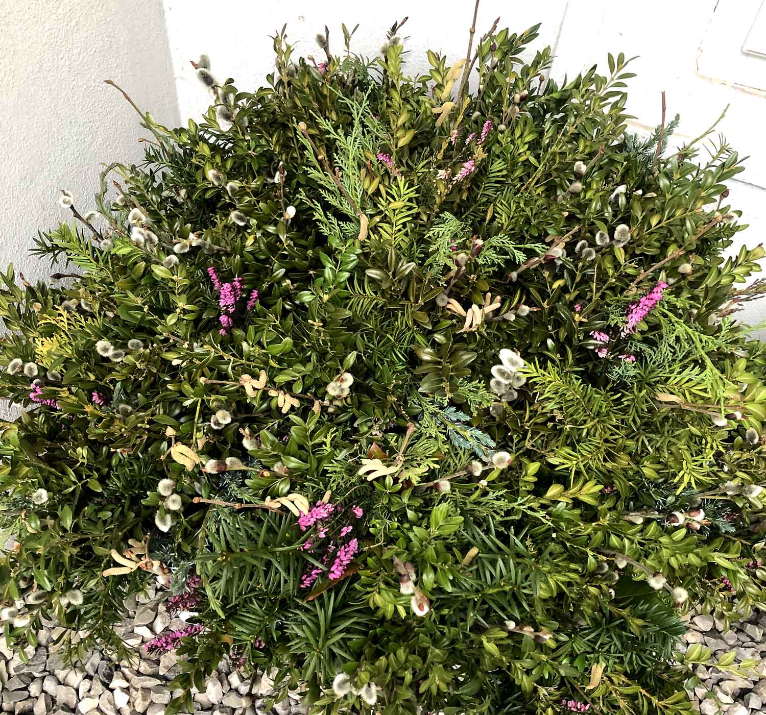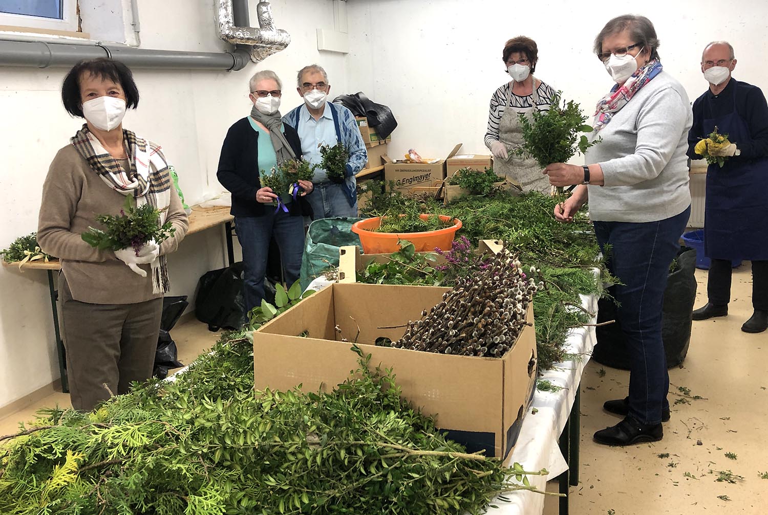 Nach einer Pause im Vorjahr haben heuer einige Frauen und Männer unserer Pfarre Corona gemäß mit Maske, Abstand und frisch getestet, eine schöne Anzahl Palmbuschen gebunden.
