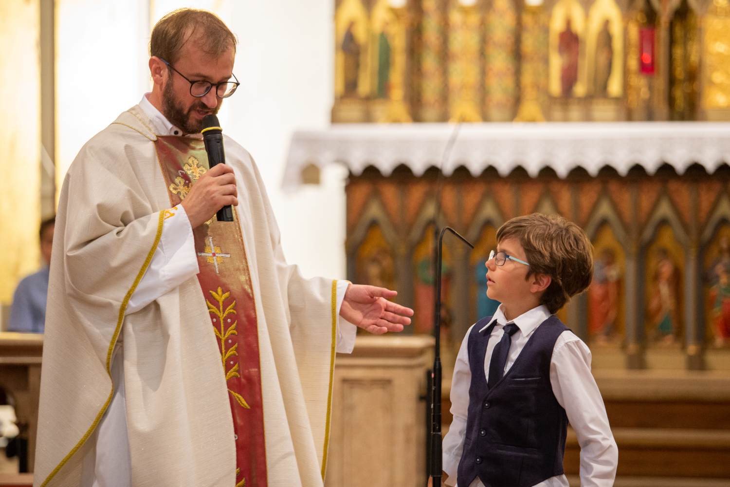 In einer einprägsamen und bildhaften Ansprache vermittelte Niko Tomic den Kindern und ihren Familien die Bedeutung dieses Tages. Lehrer und Lehrerinnen der VS 3 - ergänzt mit Freiwilligen - begleiteten mit schönen Liedern diesen Gottesdienst. Sie riefen die Kinder singend bei deren Namen, um die erste Kommunion zu empfangen.