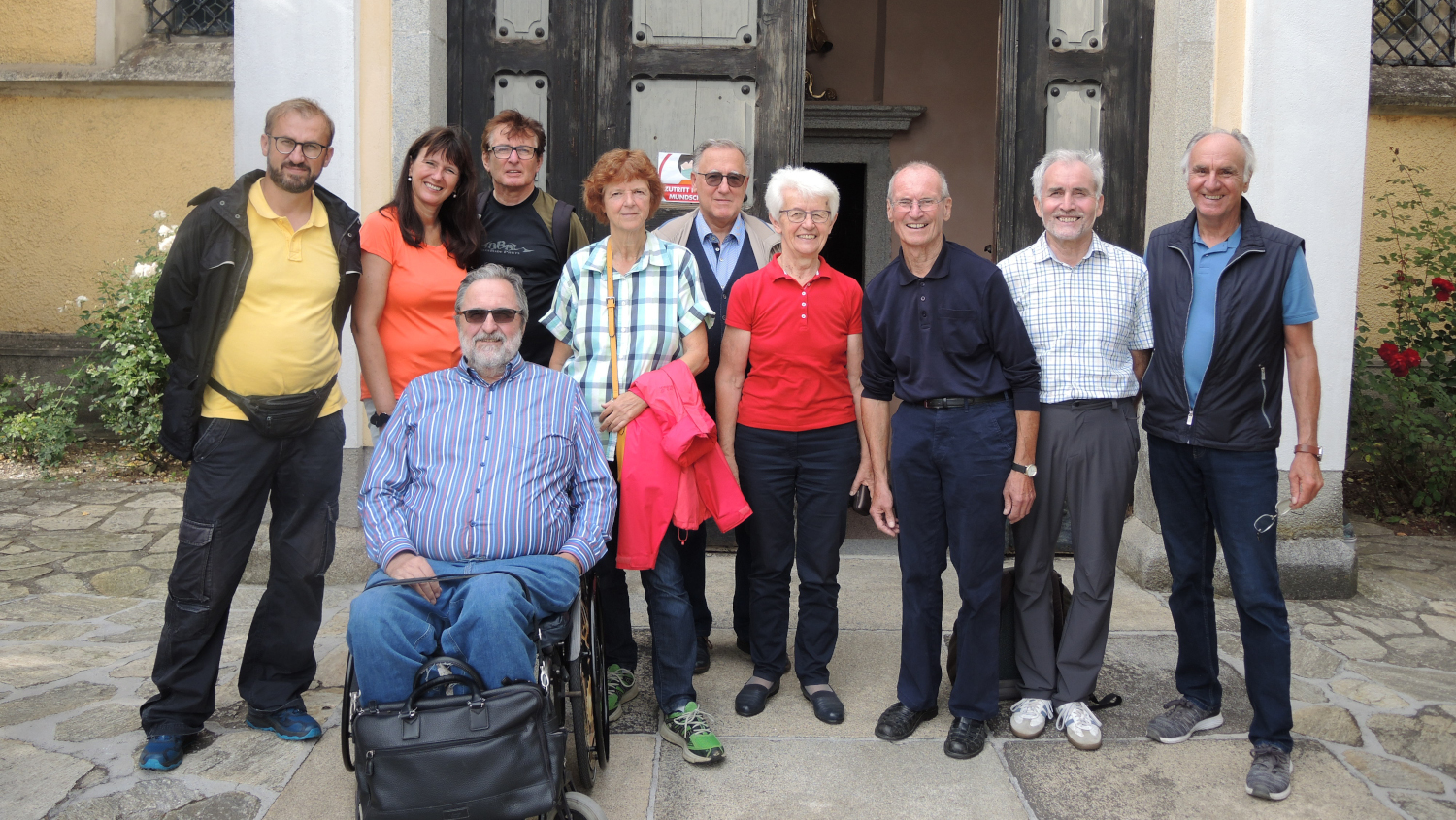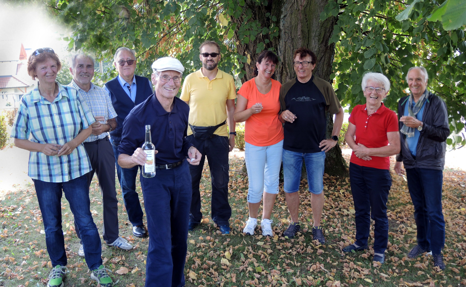 Bei der Kirche von Mistelbach, die wir leider verschlossen vorfanden, hielten wir eine kurze Rast und stärkten uns mit Obstjause und Getränk. Dabei ließen wir unser Geburtstagskind Ernst Monitzer mit einem Stamperl Marillenschnaps hochleben.