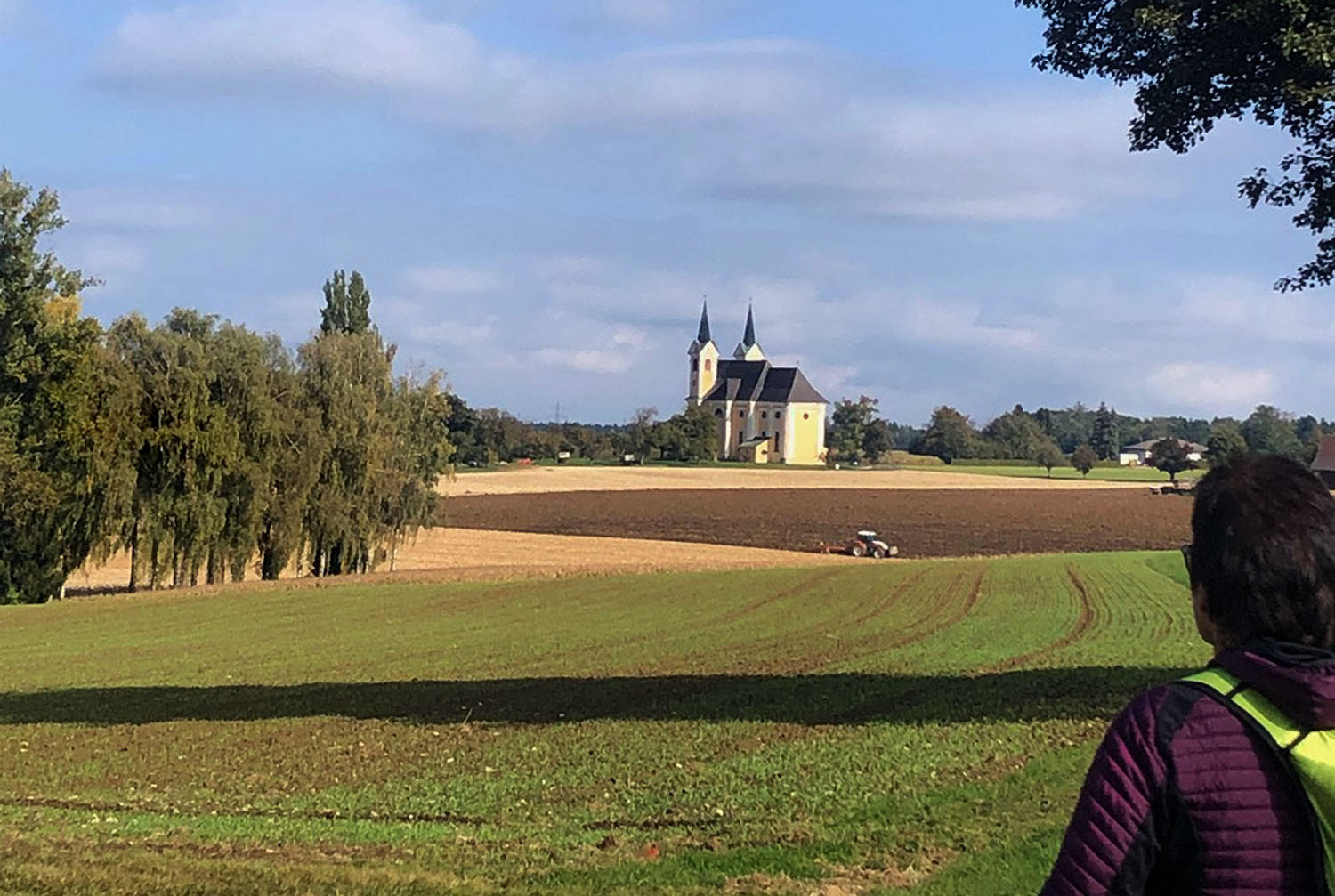 Über Landstraßen und Wiesenwege führte der 'Pilgerweg der Freude' zur Filialkirche Heiligenkreuz, die ebenfalls zum Stift Kremsmünster gehört und von 1687-1691 nach Plänen von Carlo Antonio Carlone erbaut wurde.