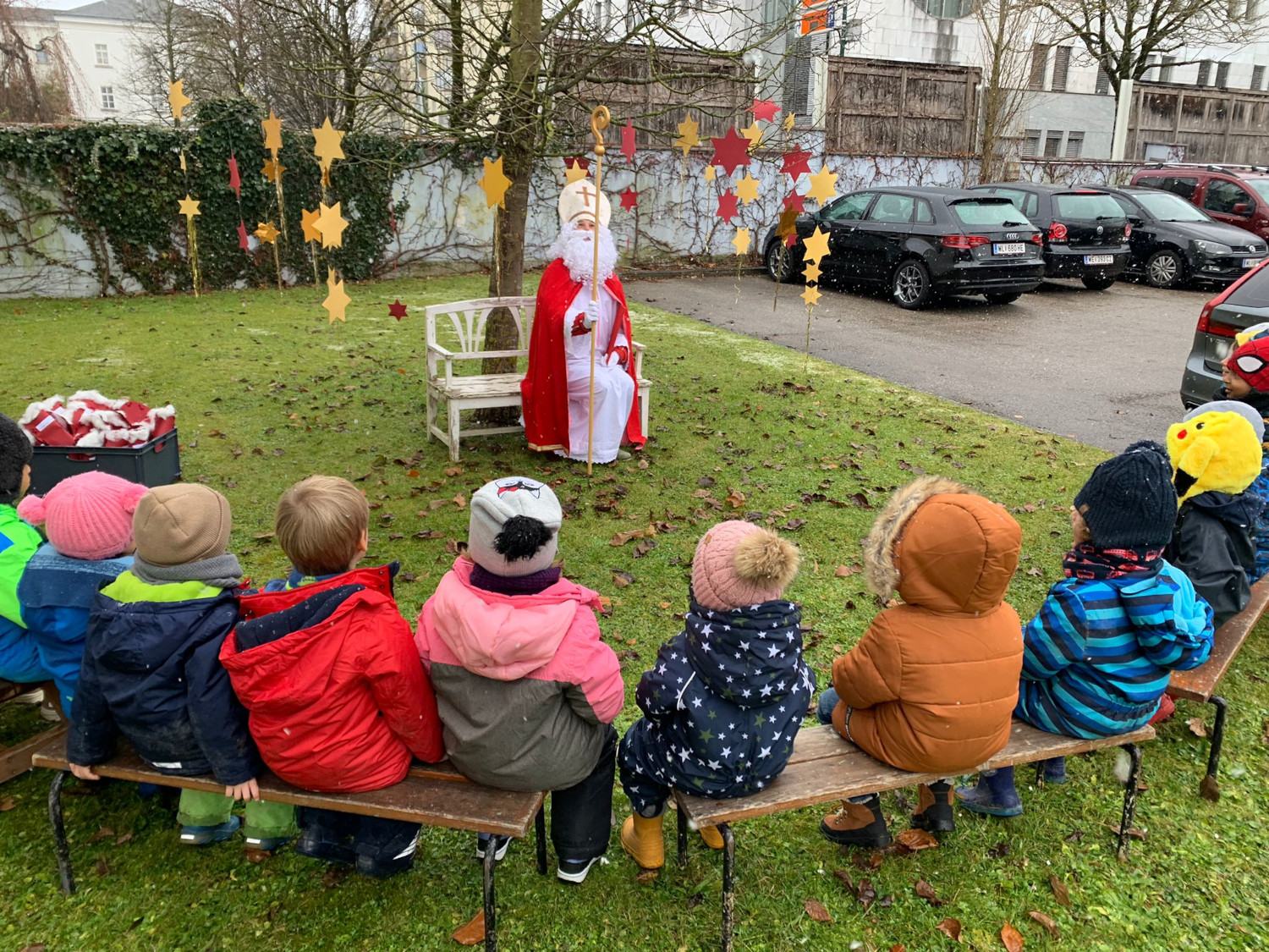 Aufgeregt versammelten sich die Kinder des Pfarrkindergartens am 07. Dezember im Garten, um den Nikolaus zu begrüßen. Lange haben sie Lieder geübt und Geschenke für ihn gebastelt. Und da kam er auch schon, durch Schnee und Wind hat er seinen Weg zu den Kindern gefunden. Einen weiten Weg hatte er mit seinen Nikolausstiefeln zurückgelegt und viele Säckchen, gefüllt mit Nüssen, Mandarinen, Schokolade und kleinen Geschenken, dabei. Die Kinder sangen ihm 'Lasst uns froh und munter sein', der Nikolaus verteilte seine Gaben, plauderte ein wenig mit den Kindern, versprach auch nächstes Jahr zu kommen und machte sich wieder auf den Weg …