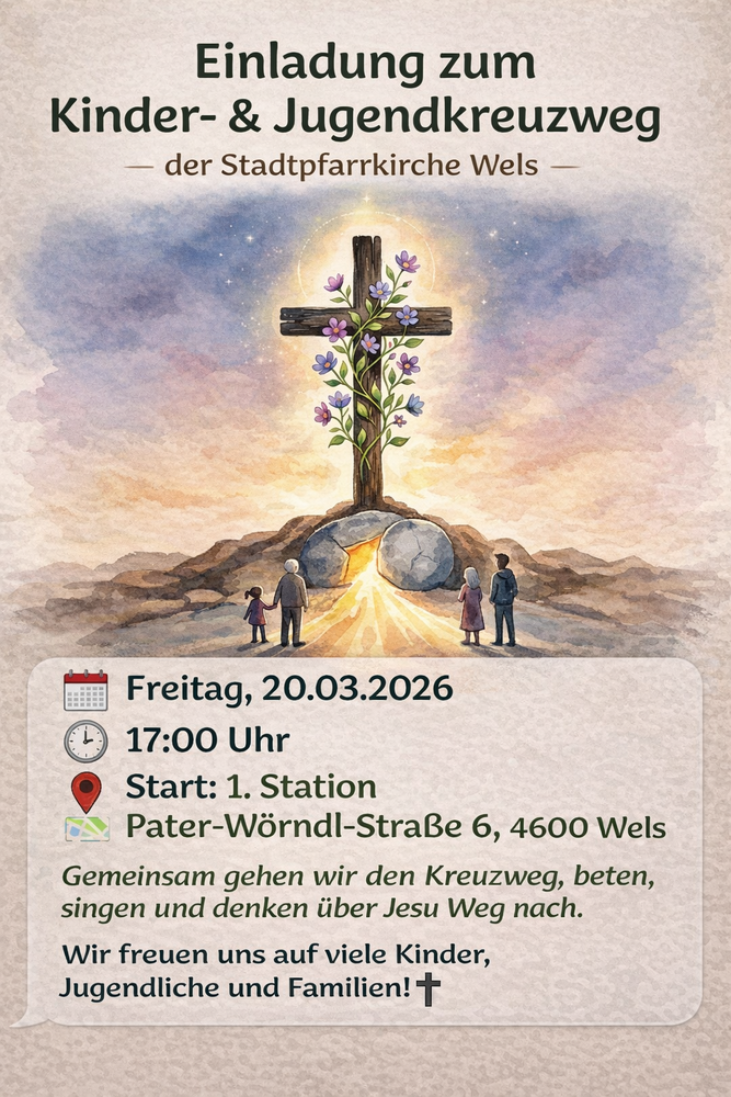 Treffpunkt ist um 17:00 Uhr bei der ersten Kreuzwegstation an der Kreuzung Salzburger Straße / Pater-Wörndl-Straße. Die Stationen werden von und mit Kindern und Jugendlichen unserer Pfarrgemeinde gestaltet.