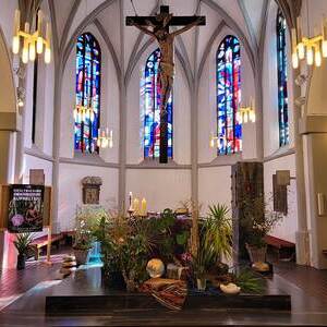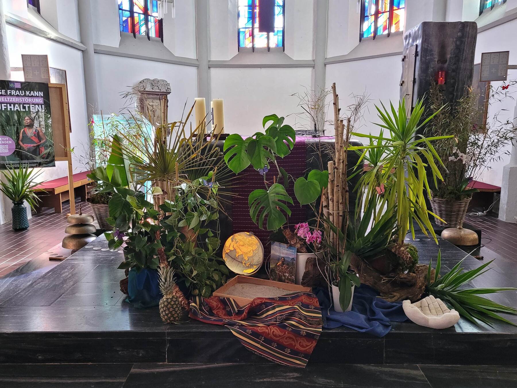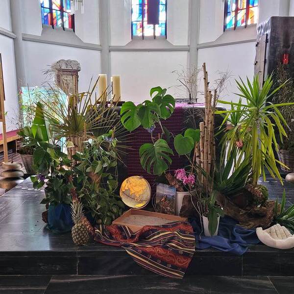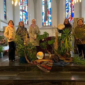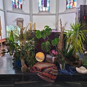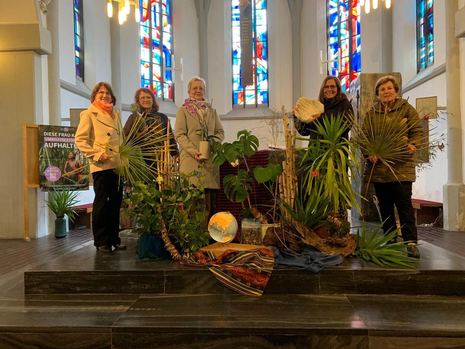 Zu diesem Anlass stellten die Kfb-Frauen sichtlich den Altarraum der Pfarrkirche in einen anderen Blickwinkel, in einen Regenwald der leidet. Anstoß dazu war die Geschichte von Aida. Eine kleinen Frau aus Kolumbien , die sich mit Entschlossenheit und Kampfgeist unermüdlich für die Erhaltung ihres Lebensraumes, dem Regenwald, einsetzt. Bei der Feier des Gottesdienstes stellte die Kfb ihr Wirken und Engagement für "Mutter Erde" den Mitfeiernden vor.