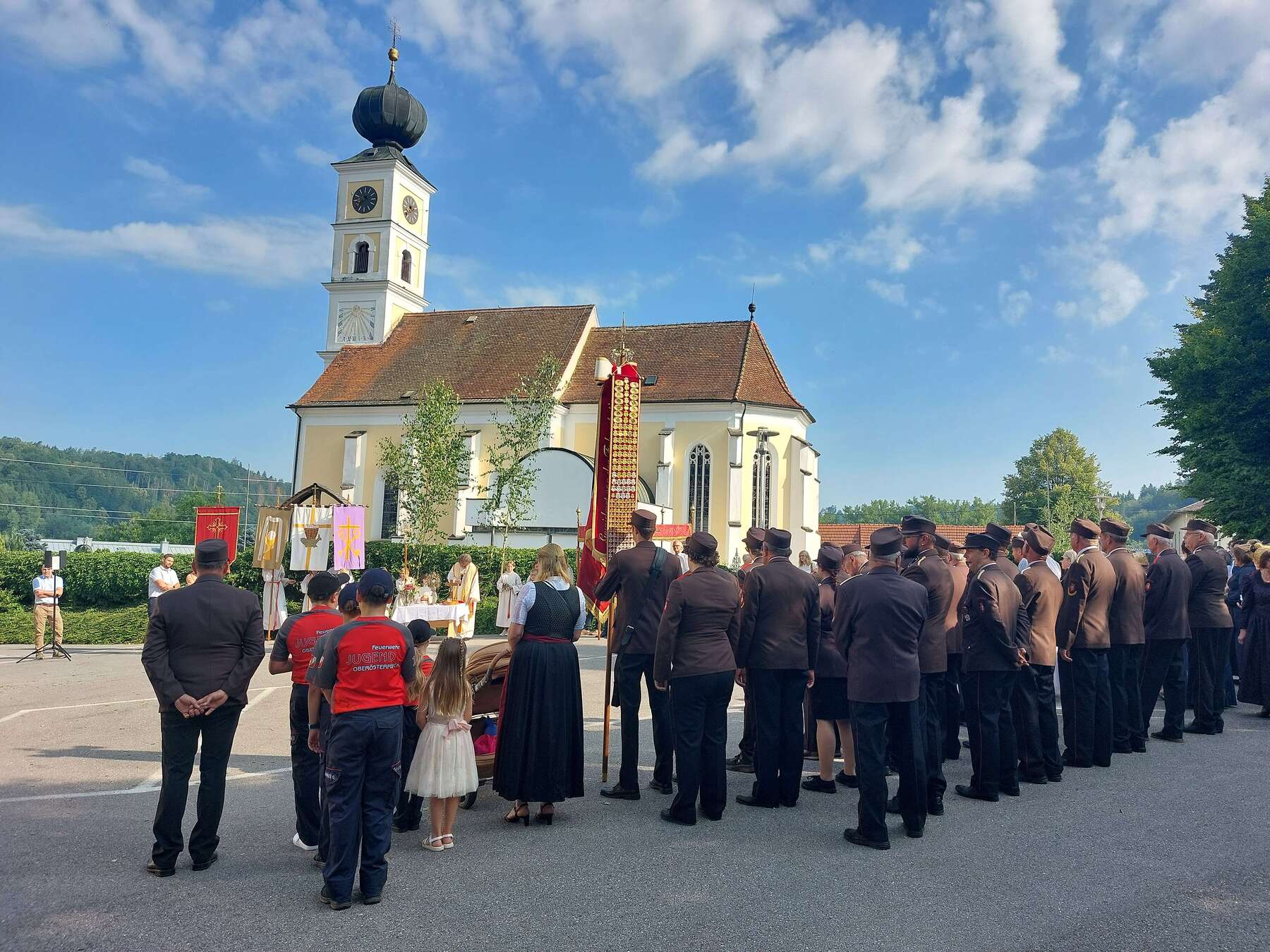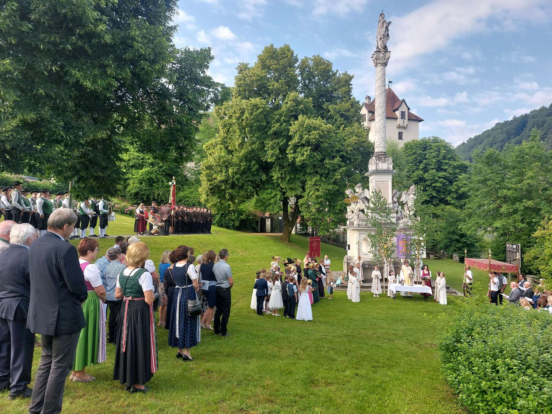 Bei strahlendem Kaiserwetter traf sich die Pfarrbevölkerung bereits um 7.45 Uhr bei der Mariensäule, bei der die Prozession mit dem 1. Altar eingeleitet wurde.