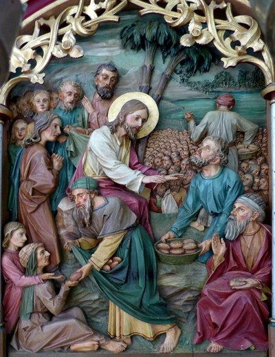 Wieder klingt das Wort der Aussendungsrede an: Die Ernte ist groß… Zugleich aber zeigt das heutige Evangelium etwas Zusätzliches: Ihr braucht nicht mehr als das zu geben, was ihr zur Verfügung habt. Das sind nur fünf Brote und zwei Fische. (Bei der Hochzeit zu Kana ist das, was die Diener der Hochzeit zur Verfügung haben, nur Wasser!) Gebt, was ihr habt, und ihr werdet selbst staunen, wieviel ihr eigentlich geben könnt. Wenn ihr bereit seid, weiterzugeben, was Gott euch durch seinen Segen überträgt, so wird das unermesslich groß und menschlich nicht zu fassen sein.