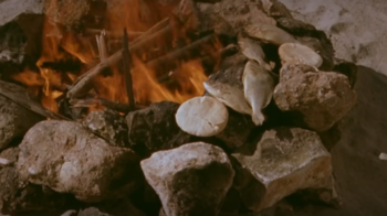- Kohlenfeuer, Brot und Fisch
