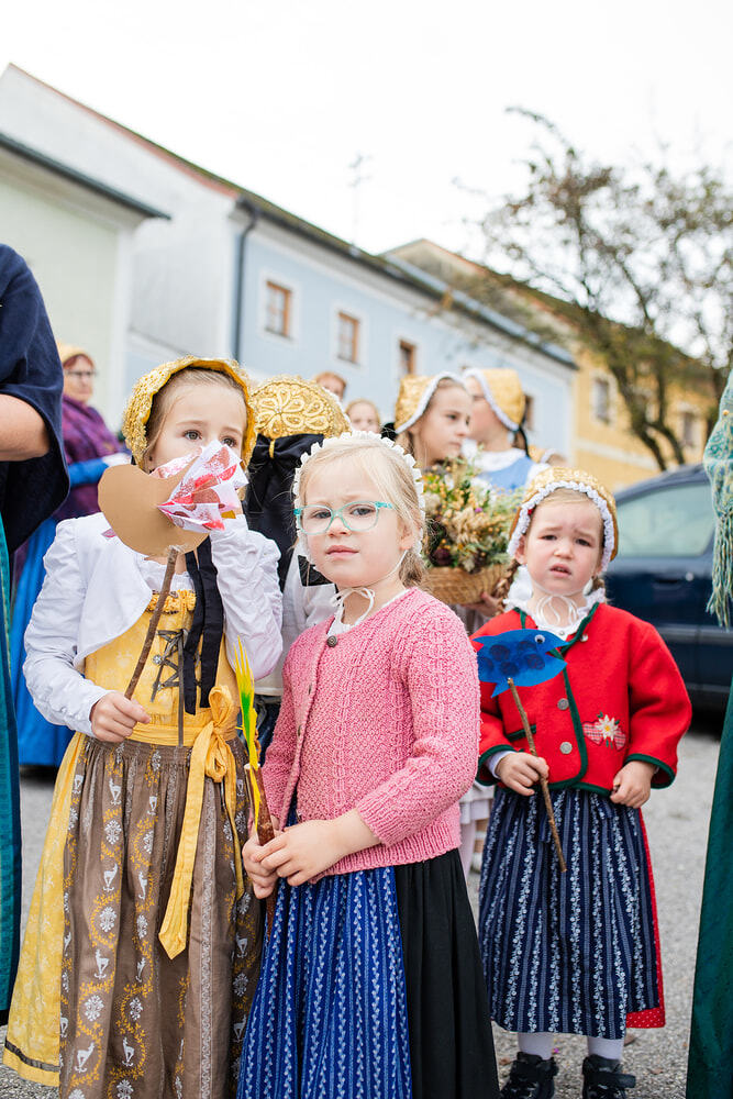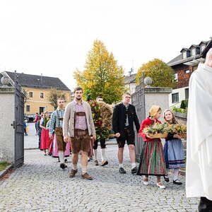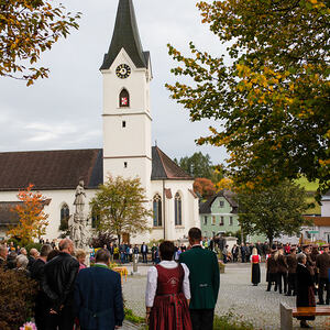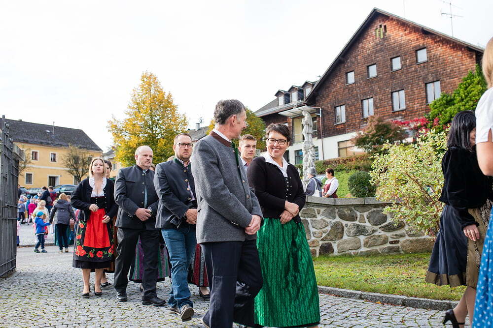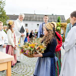 Gemeinsam mit Franz Mayrhofer dankten diese für die Ernte und die Gaben des heurigen Sommers. Anschließend wurden von den Goldhauben selbstgebundene Ernte-Sträußchen verteilt.