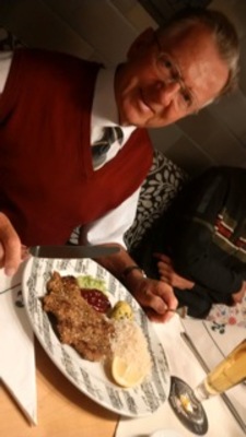 Passend wurde Herrn Pfarrer das Essen auf einem Teller mit Noten Dekor serviert. Im Nebenraum speiste Dennis R. Davies mit einigen Musikern. Herr Pfarrer sprach einige Worte mit dem Dirigent und erhielt ein Autogramm. Ein schöner Abend anlässlich eines besonderen Jubiläums fand mit diesem Höhepunkt seinen Ausklang