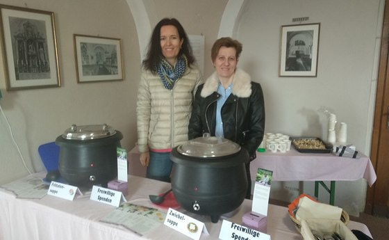 Im Anschluss an die Messe wurden die im hinteren Teil der Kirche vorbereiteten Suppen ausgeteilt. Die Palette reichte von regionaler Frittatensuppe über Kürbis-, Zwiebel- und Kartoffelsuppe bis zu afrikanischer Bohnensuppe. Die Besucher waren auch eifrige Verkoster und Spender.