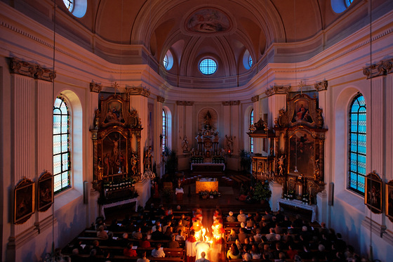 Die einschiffige Kirche bietet von allen 700 Plätzen (150 davon in der ersten Empore und weitere im darüberliegenden Chor) eine gute Sicht auf den vor ca. 20 Jahren neu und sehr großzügig angelegten Altarraum.