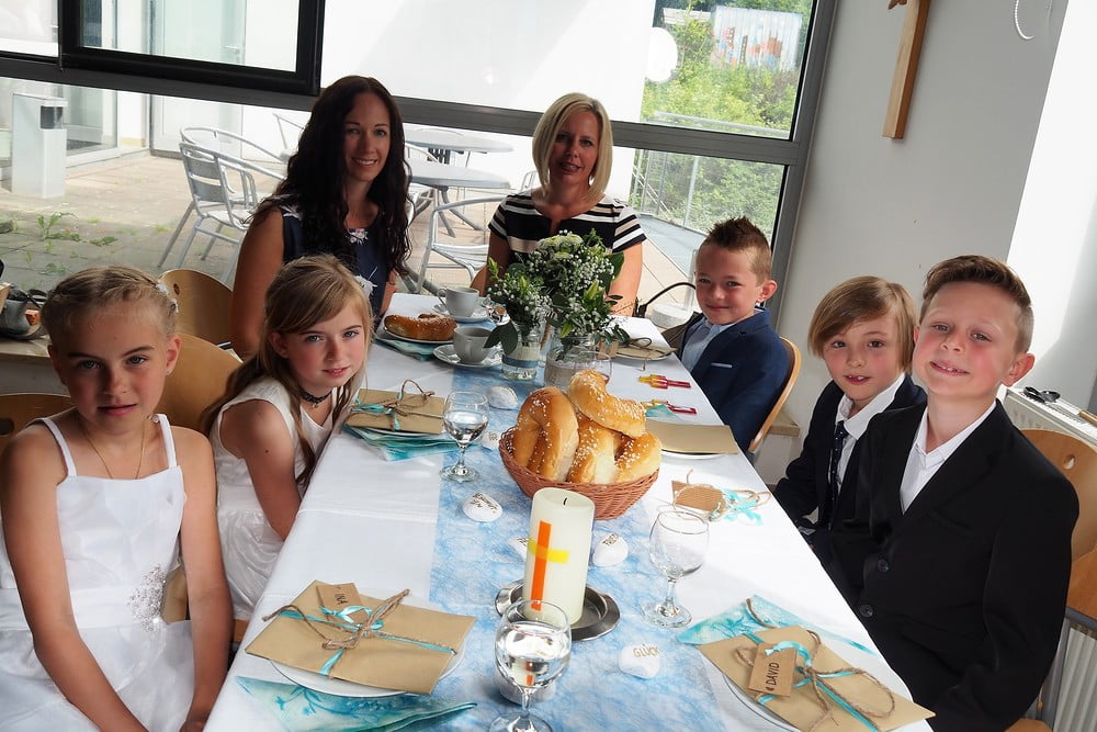 32 Erstkommunionkinder waren nach der sehr schön gestalteten Messe zu einem kleinen Frühstück im Buffet eingeladen. Mit den Tischmüttern, den Lehrerinnen, Pfarrmoderator Mag.Franz Harant und Pfarrassistent Dr. Hermann Deisenberger genossen sie Kipferl und Getränk.
