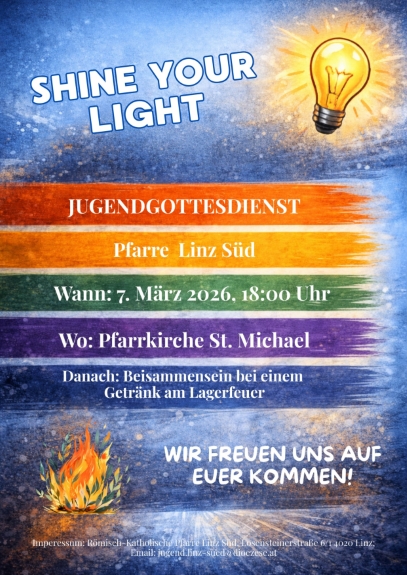 Jugendmesse Linz - SÜD Am 7. März feiern wir als Pfarre Linz-Süd zum 1. Mal gemeinsam eine Jugendmesse. Sie findet in der Pfarre St. Michael am Bindermichel um 18:00h statt. mehr: Jugendmesse Linz - SÜD